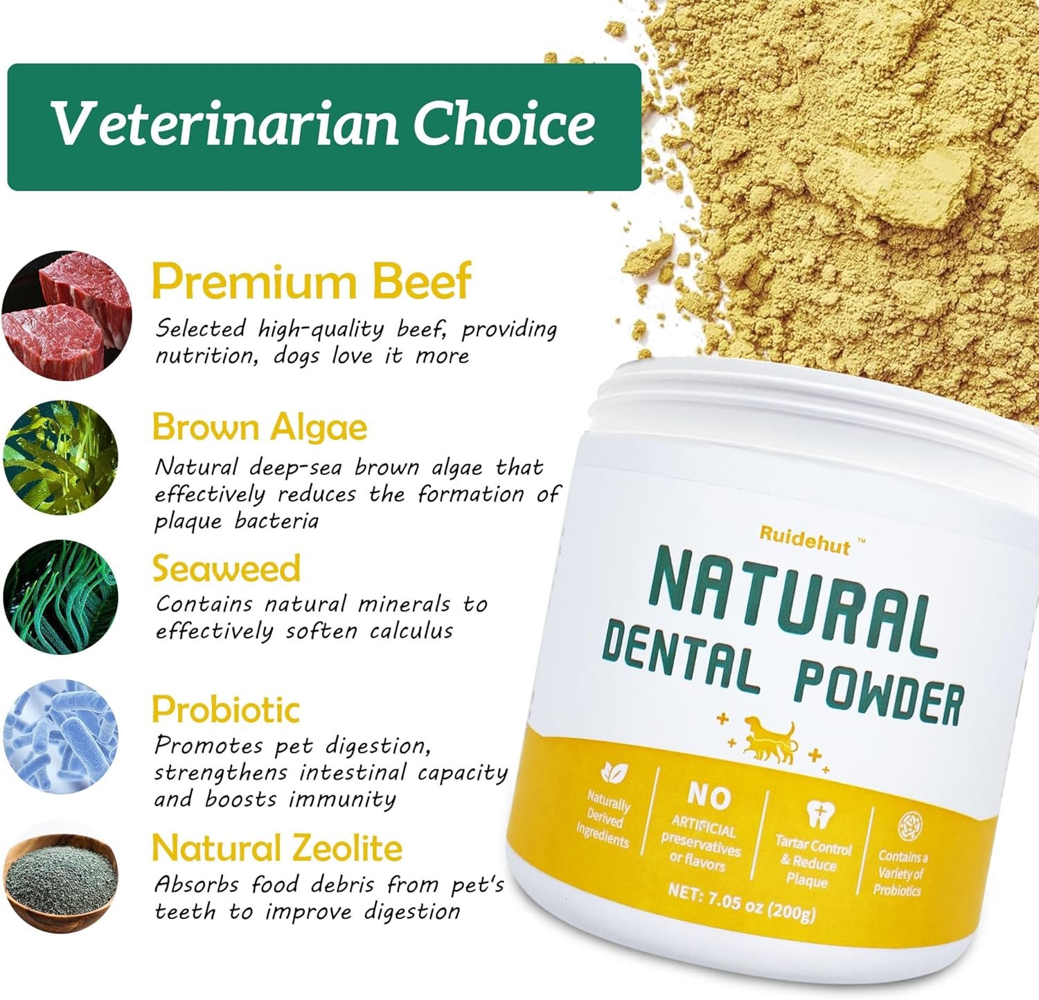 REMOVES PLAQUE & TARTAR: Our dog dental powder contains natural enzymes and zeolite powder particles, which can penetrate deep into the gaps between teeth to soften and remove tartar. The natural active ingredients in seaweed and brown algae are rich in minerals and antioxidants, which can slow down the formation of plaque and promote oral health.