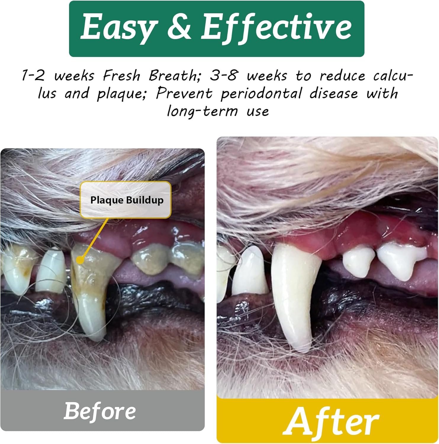 LONG-TERM USE IS BETTER: Please keep on giving your dog dental care, plaque and tartar will be significantly reduced after 3 to 8 weeks of continuous use. The longer you use it, the more effective the dental care will be.