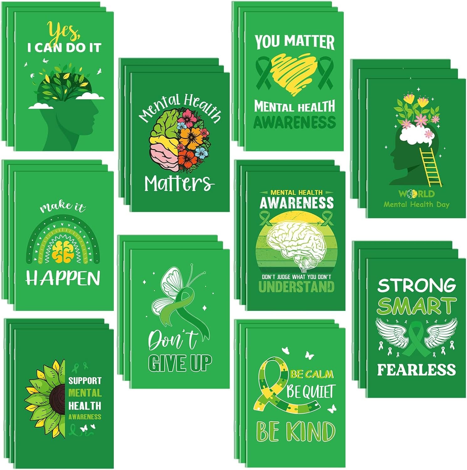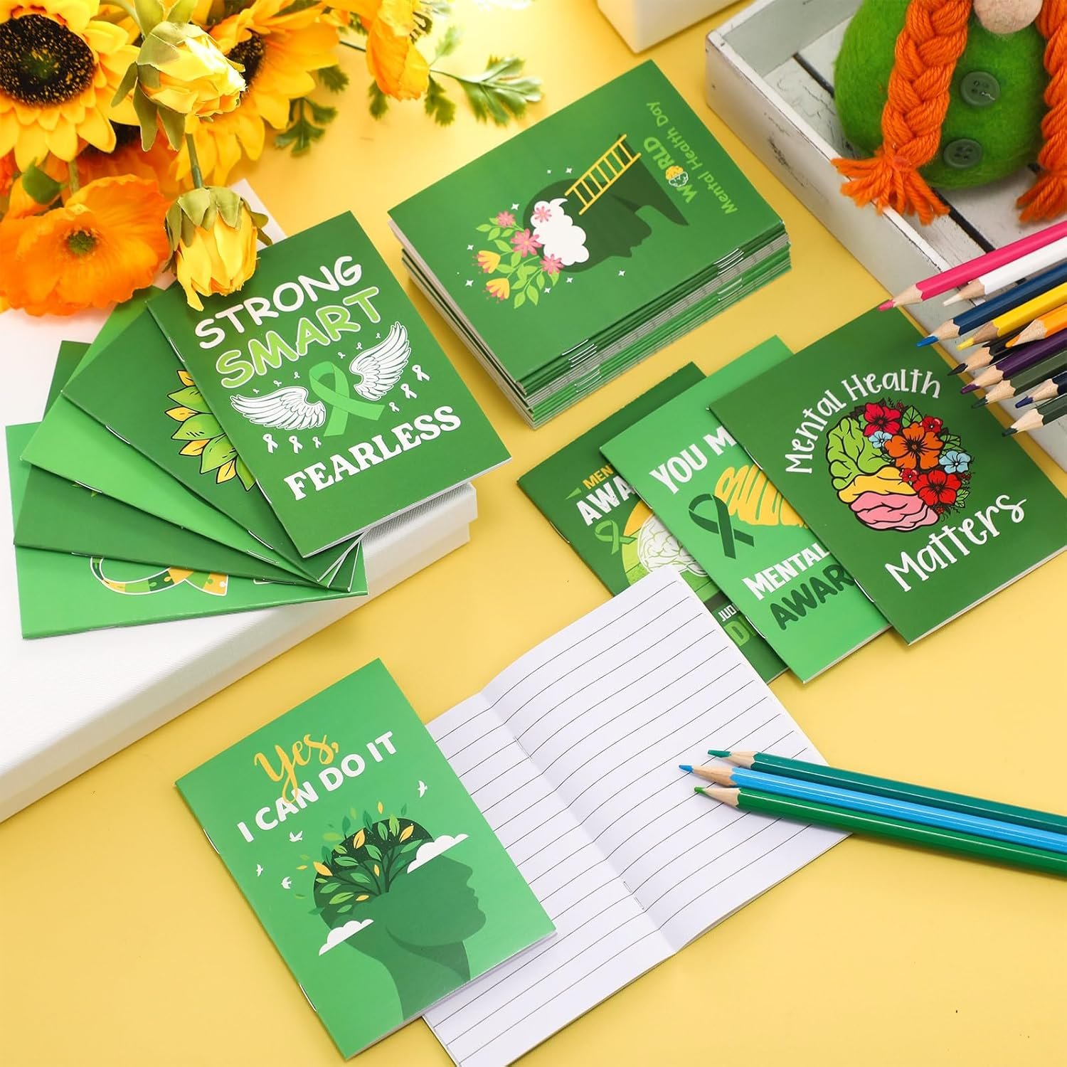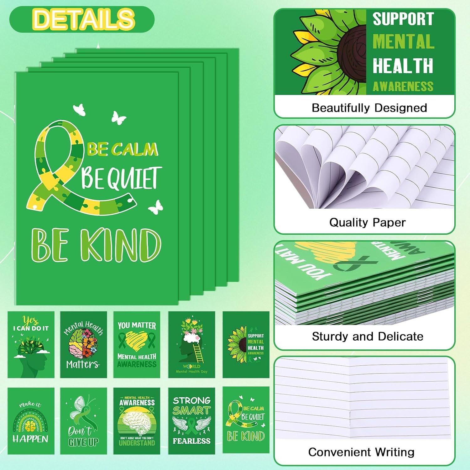 Green, Mental Health Themed Design: the main color of the small notebook is green, nicely symbolizing mental health; Besides, the notepad surfaces are decorated with mental health symbol patterns; This delicate and thoughtful design not only helps to raise mental health awareness but also adds a nice aesthetic touch to your note taking experience
