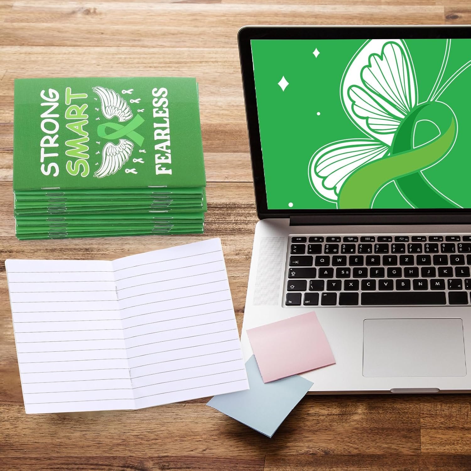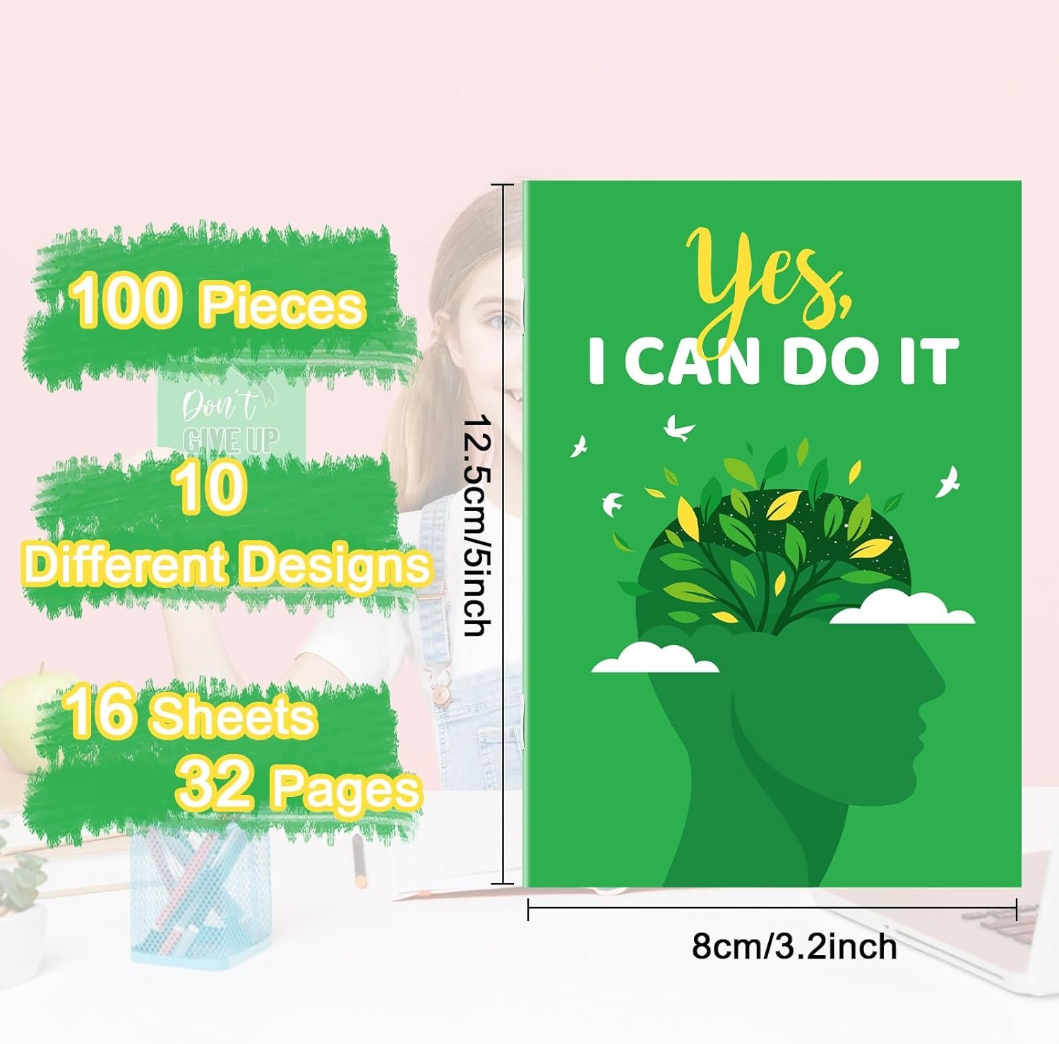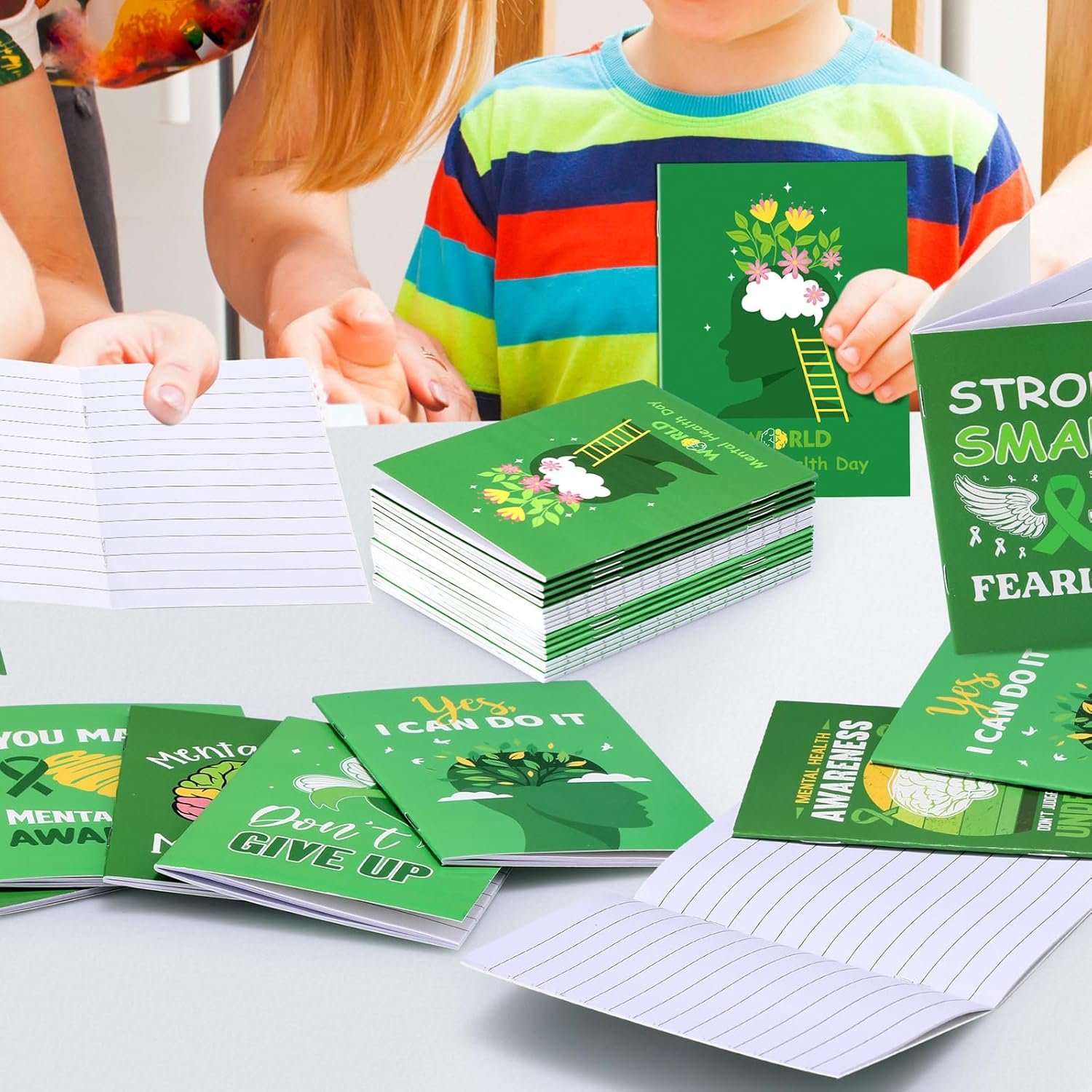 Green, Mental Health Themed Design: the main color of the small notebook is green, nicely symbolizing mental health; Besides, the notepad surfaces are decorated with mental health symbol patterns; This delicate and thoughtful design not only helps to raise mental health awareness but also adds a nice aesthetic touch to your note taking experience