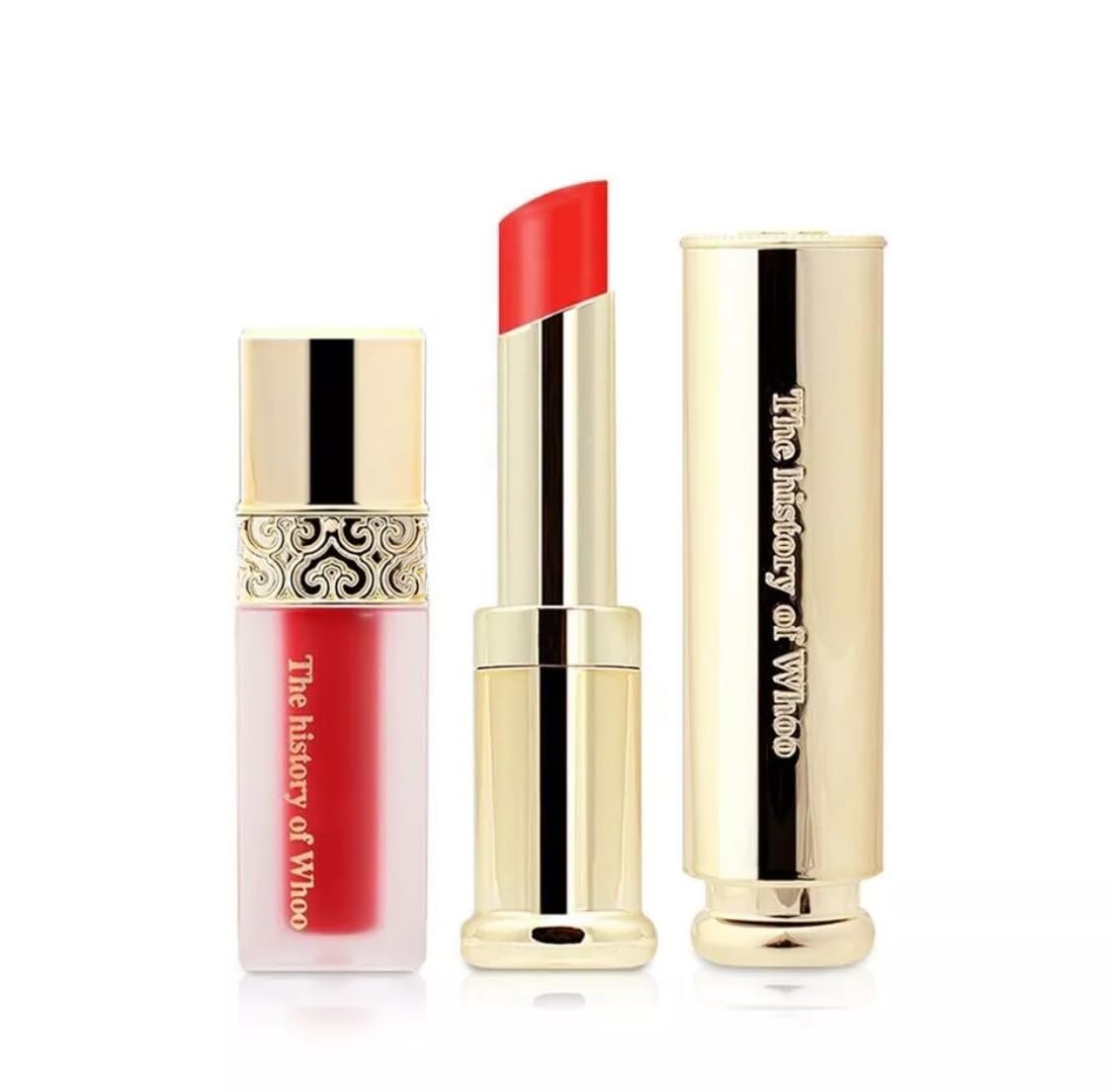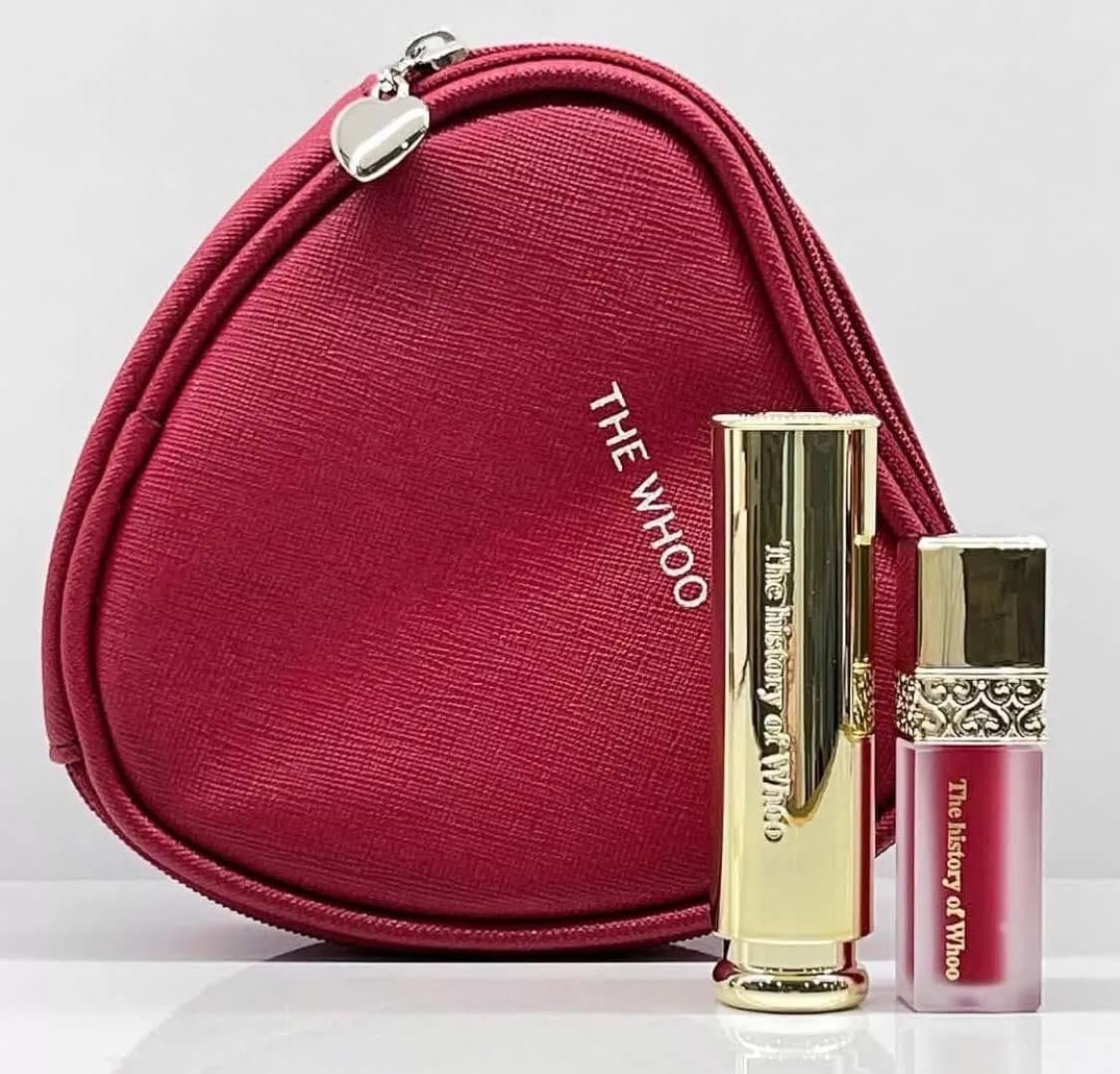 Korea Makeup Product_The Whoo Glow Lip Balm Special Set. Color: Red SPF10 3.3g & Velvet Liquid Lip Rouge No.45 Royal Red 2.1g – Long Lasting, Lips Moisturizing. Set contains: 1. Gongjinhyang Mi Glow Lip Balm Red (SPF10) —3.3 gm 2. Gongjinhyang Mi Velvet Liquid Lip Rouge No.45 Royal Red (Sample) —2.1 gm 3. Mini Heart Pouch (Sample) —1 each