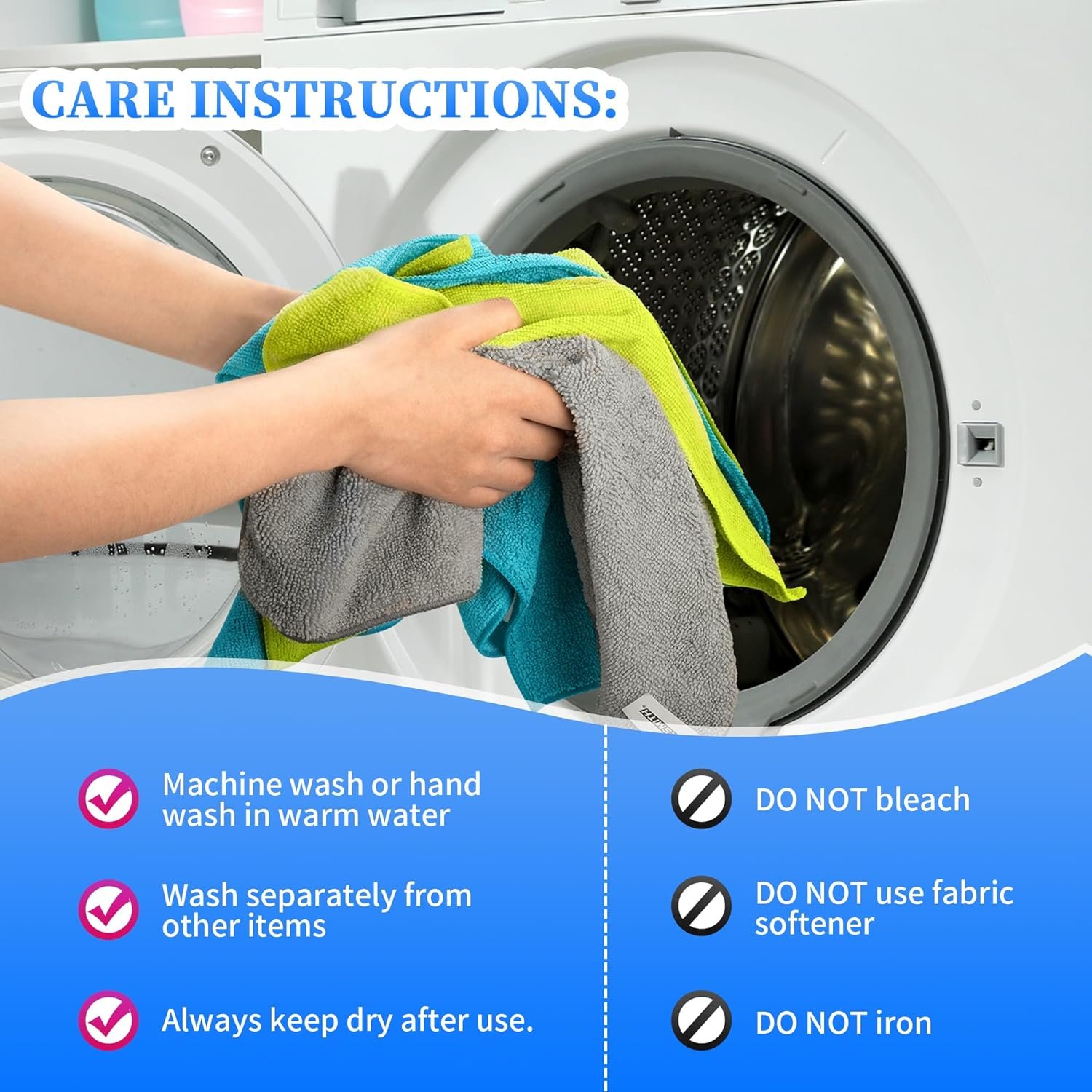 USE & CARE: Hand or machine wash in warm water separately from other items.DO NOT use fabric softener.DO NOT bleach,DO NOT iron. ALWAYS keep dry after use.