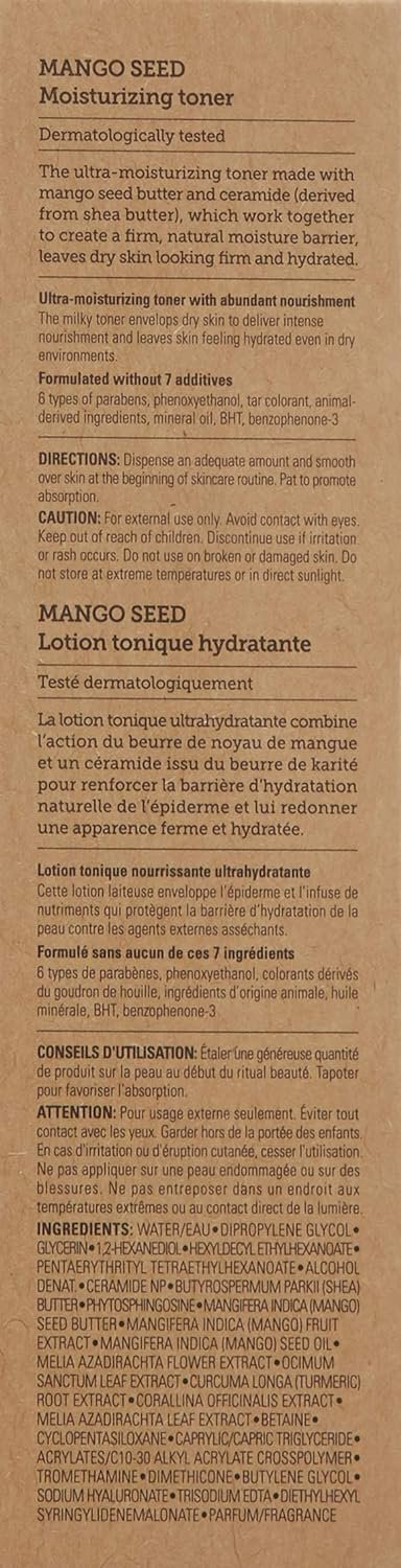 About Mango seed line: Mango seed, shea butter and ceramide bring volume for your face with subtly sweet-scented. An intensely hydrating and nourishing skincare products with mango fruit extract and mango seed butter, this one delivers rich and everlasting moisture to intensely dry skin thereby making it softer, supple, and radiant. (1) Ultra-moisturizing lotion that deeply hydrates skin for a radiant look – The nouishing and moisturizing lotion dellivers healthy radiance to dry, flaky skin that has lost its shine, leaving it silky smooth. (2) Formulated without 7 additives – 6 types of parabens, phenoxyethanol, tar colorant, animal-derived ingredients, mineral oil, BHT, benzophenone-3