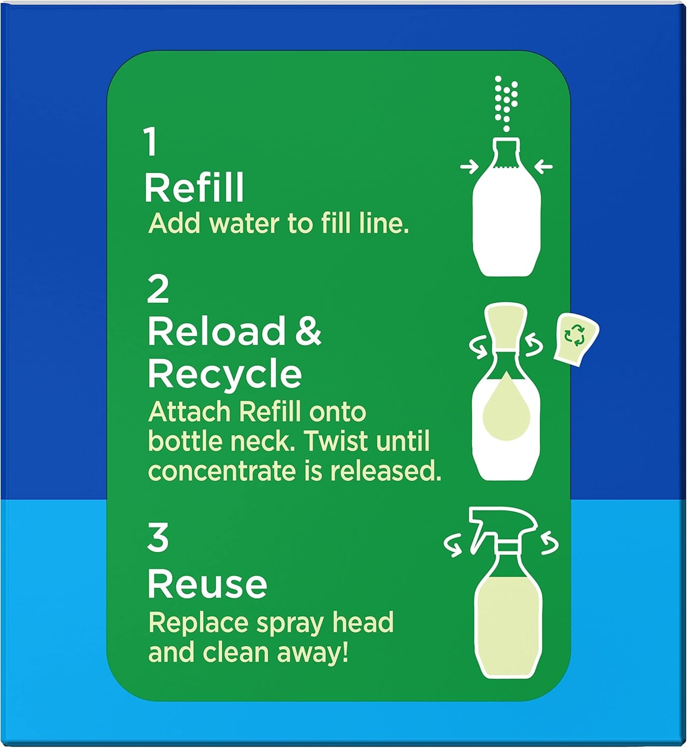 JUST ADD WATER: Refill your all-purpose cleaner spray bottle with tap water, twist a refill pod into the bottle, reattach the spray trigger and you’re ready to start cleaning