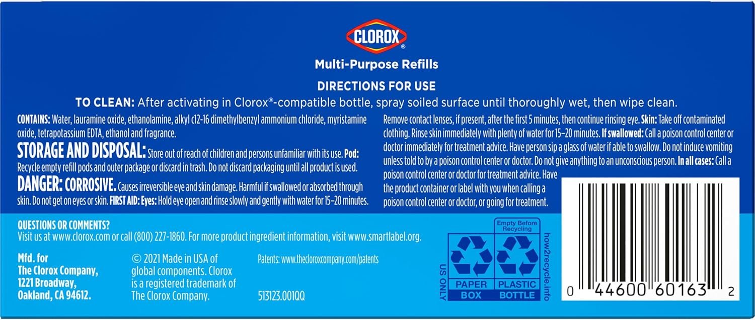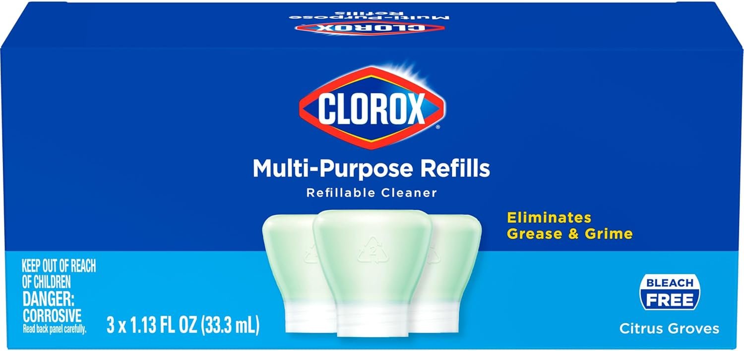 Refill your Clorox Refillable Cleaner reusable spray bottle with Clorox All-Purpose Cleaner Refill Pods. Clorox All-Purpose Cleaner has the same Clorox cleaning power* to remove the toughest stains around your house, leaving behind a delightful lemon scent to freshen your home. The all-purpose cleaner is bleach-free and specially designed to remove dirt, grease and grime from multi-surfaces, such as countertops, appliances, sinks and toilets. These concentrated refill pods are easy to use: refill your Clorox All-Purpose Refillable Cleaner bottle with tap water and twist on the concentrated refill pod until it clicks. Concentrated pods are easy to store, making it convenient to have more on hand. By switching to this refillable cleaning system that uses 80% less plastic**, you can help save the equivalent of 1 million plastic bottles***. *Vs. Clorox All-Purpose Cleaner. **80% less plastic by replacing thirty Clorox 16 fl oz spray cleaners. ***Vs. non-refillable spray cleaners.
