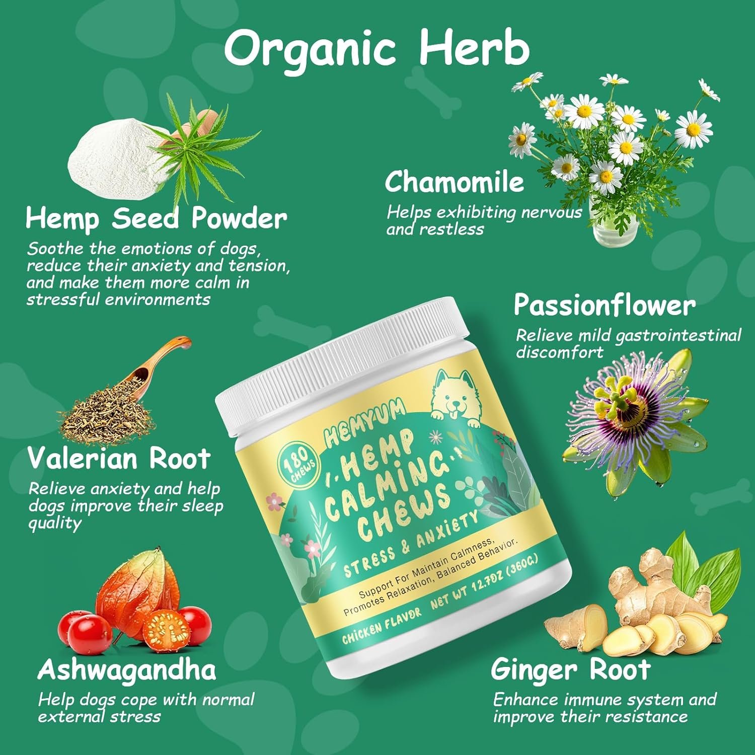 Natural Stress and Anxiety Relief: Soothe your pup’s nerves with Hemyum Calming Chews—crafted with organic hemp seed powder, chamomile, L-theanine, and L-tryptophan to ease anxiety during storms, fireworks, travel, or separation. Gentle yet effective for dogs of all sizes!