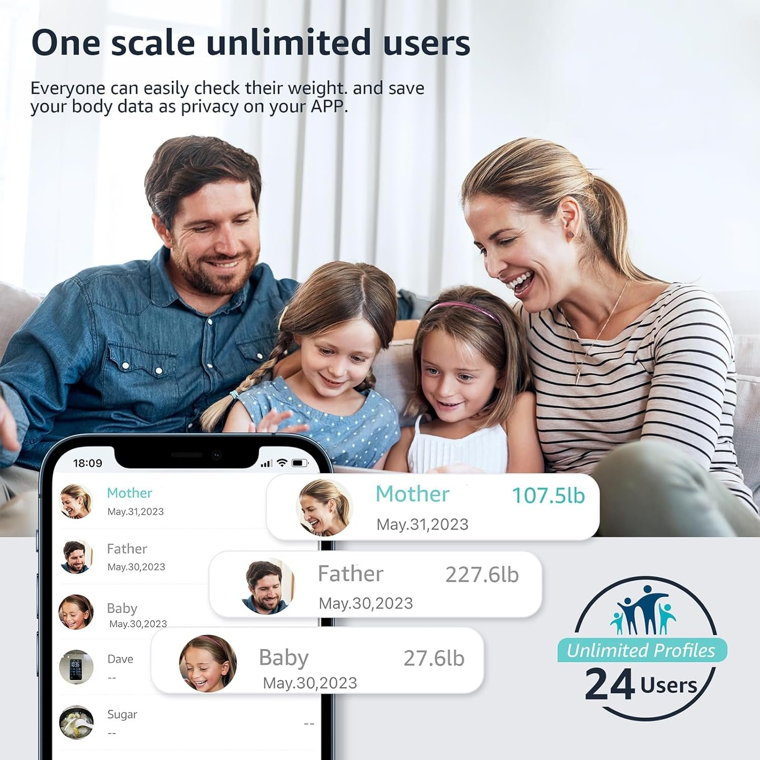 Sync with Health Apps – FITDAYS app on IOS and Android, and FITDAYS app can easily sync with other fitness Apps like Apple Health, Google Fit, Samsung Health, Fitbit and so on, which let you store and share your data more conveniently. Fitdays App allows you to create unlimited profiles 24 Users for your family and friends with only one smart scale. It is very helpful and convenient for those who keep fit and do health sports for improvement goal.