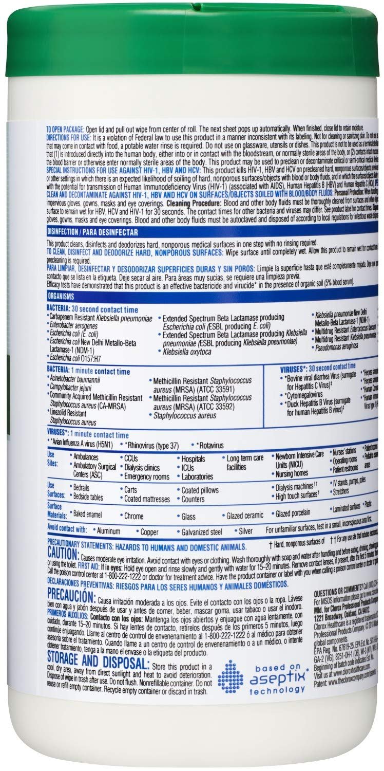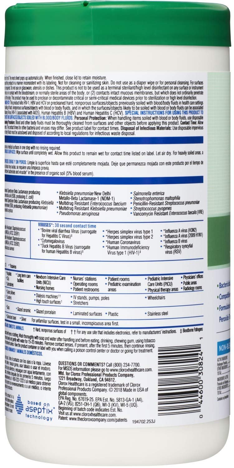 Great surface compatibility, less residue. Clorox Healthcare Hydrogen Peroxide Cleaner Disinfectant Wipes leave no harsh chemical odor or fumes and kill bacteria and viruses in 30 seconds*. Disinfect with one wipe that is registered to kill C. auris, 13 antibiotic resistant pathogens and multiple strains of MRSA. This ready to use broad spectrum disinfectant has a noncorrosive formula suitable for cleaning medical devices, common areas and high touch surfaces made of materials like stainless steel, painted metals, glass, chrome, glazed tile, plexiglass and sealed fiberglass. These Clorox Healthcare hydrogen peroxide wipes are ideal for daily use in healthcare settings including hospitals, medical facilities, outpatient facilities and long term care facilities. *See label for organisms.
