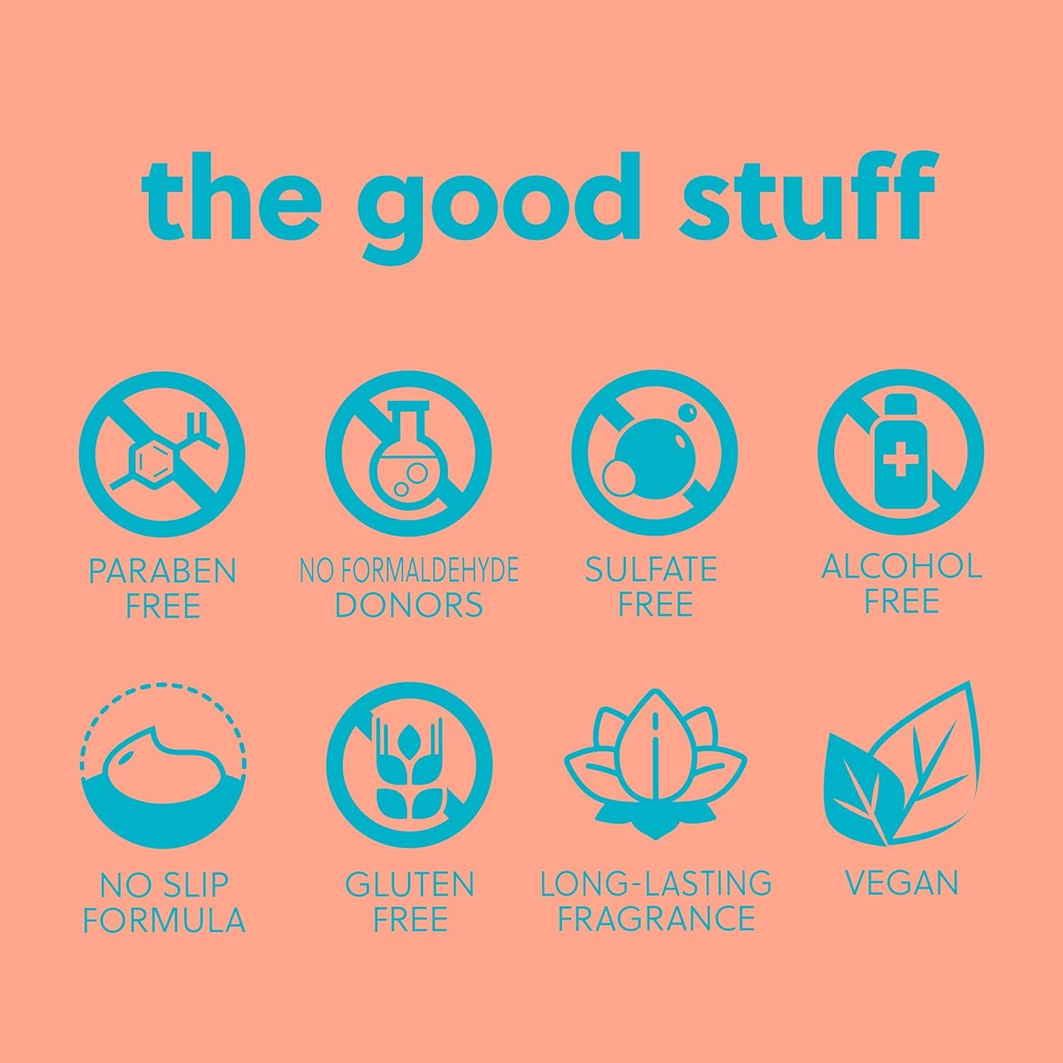 Vegan, paraben free, sulfate free, alcohol free, no formaldehyde donors, has a no-slip formula and long-lasting fragrance