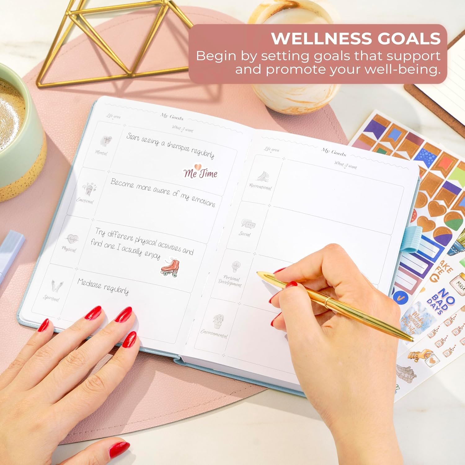 Set goals in each area of your life that will enhance your well-being, with space for eight areas – physical, emotional, spiritual, and more.