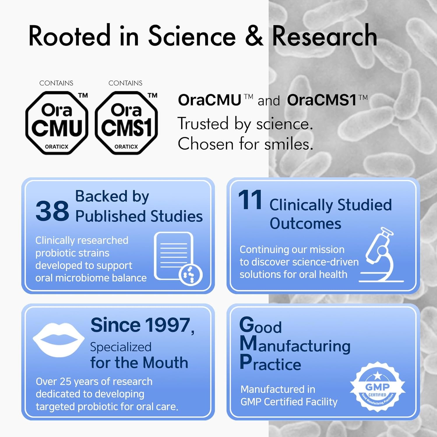 Experience improved oral health and boost your overall wellbeing with our clinically researched, patented probiotic strains. Our specially developed strains are designed to help maintain and strengthen your oral health, which is an important indicator of your overall health, and an essential part of your immune system.