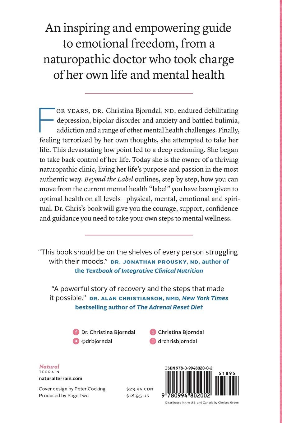 For years, Dr. Christina Bjorndal, ND, endured debilitating depression, bipolar disorder, and anxiety and battled bulimia, addiction, and a range of other mental health challenges. Finally, feeling terrorized by her own thoughts, she attempted to take her life. This devastating low point led to a deep reckoning. She began to take back control of her life. Today she is the owner of a thriving naturopathic clinic, living her life’s purpose and passion in the most authentic way. In Beyond the Label, Bjorndal outlines, step-by-step, how you can move from the current mental health “label” you have been given to optimal health on all levels – physical, mental, emotional, and spiritual. Dr. Chris’s book will give you the courage, support, confidence, and guidance you need to take your own steps to mental wellness.