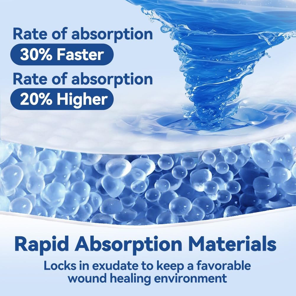 1S Instantly Absorbs&Locks in Exudate – The unique SAP-composite absorbent core has high absorption properties, converting exudate to gel in 1 second, reducing the risk of maceration. It also absorbs up to 20 times its own weight in exudate, reducing the frequency of dressing changes