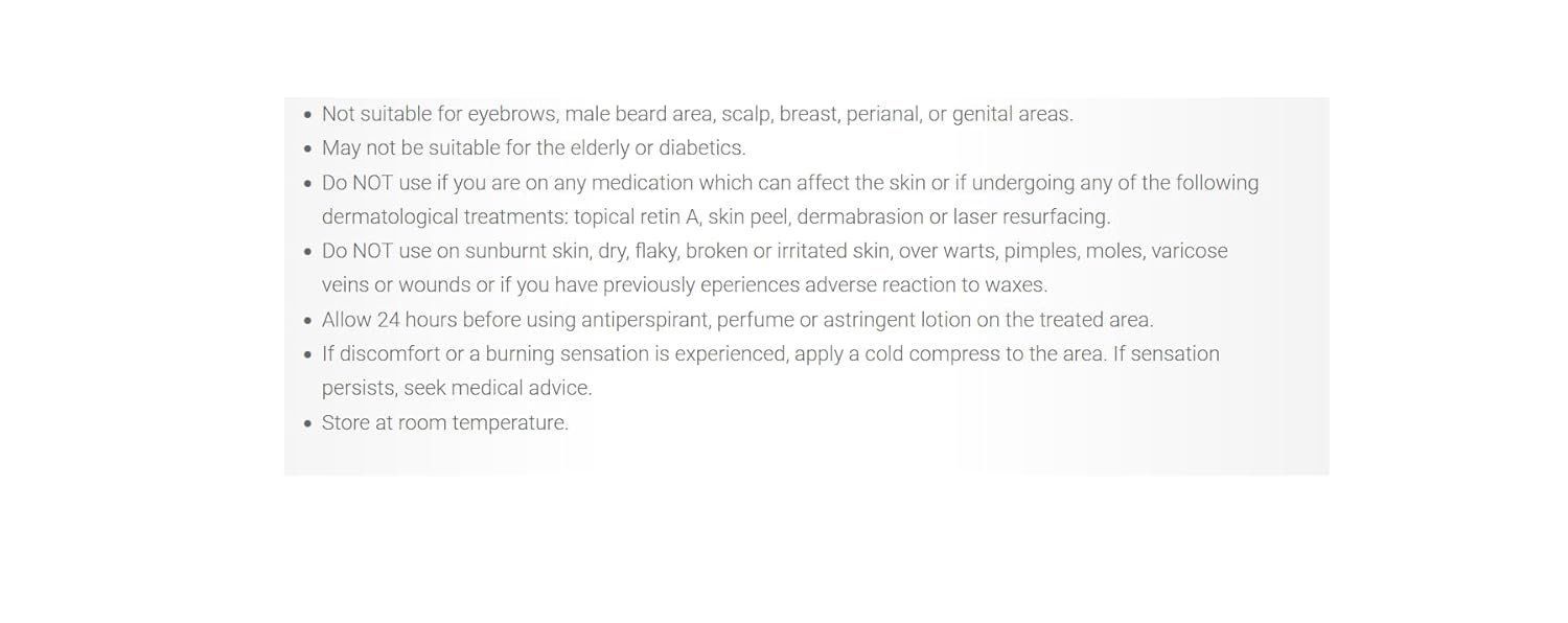 SAFETY: Please read precautions and instructions before use; NOTE: It’s important NOT to wax the same facial area twice as repeated waxing of this delicate area can cause irritation.