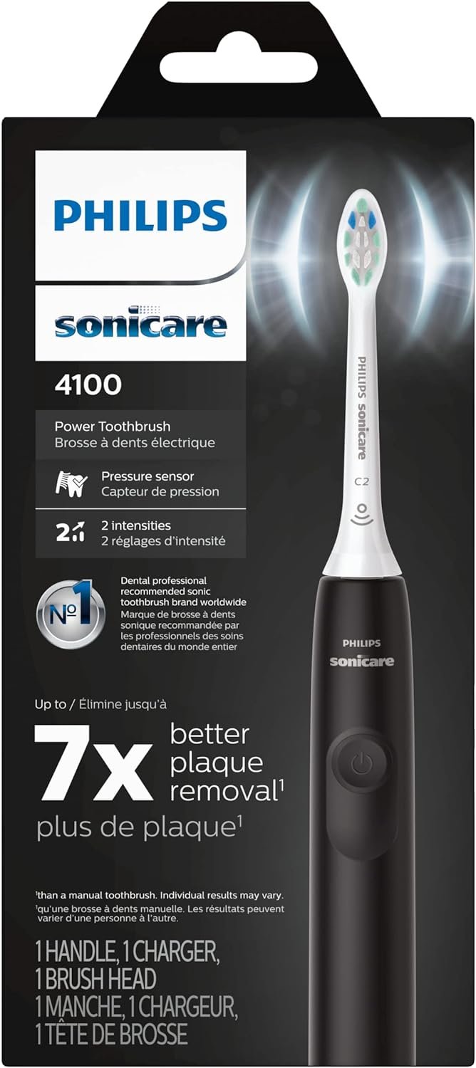 Elevate your dental hygiene routine with the philips sonicare 4100 electric toothbrush, designed for ultimate oral care. The toothbrush provides a powerful yet gentle cleaning action that removes up to 7x more plaque vs. A manual toothbrush, promoting gum health and overall wellness. With a pressure sensor and two intensity settings, this electric toothbrush is tailored to protect sensitive gums and optimize your brushing experience. The included c2 optimal plaque control brush head ensures a thorough clean with its soft nylon bristles, while the round head shape allows for easy manoeuvrability. The toothbrush’s smartimer and quadpacer guarantee that you brush for the dentist-recommended two minutes, making your dental hygiene routine efficient. The philips sonicare 4100 is a reliable companion, at home or on the go − it works perfectly as a travel toothbrush as well. The set includes a charger to maintain its long-lasting lithium-ion battery that operates for up to two weeks on a single charge. The brushsync technology tracks how long you’ve been using your brush head for, and how hard you’ve been brushing.the brushsync replacement reminder on your handle and a short beep gives you a heads up when it’s time to replace the brush head. With its sleek white design and ergonomic handle, the philips sonicare 4100 not only prioritizes your oral health but also delivers comfort and durability, making it a smart addition to your wellness routine. Make the switch to a philips sonicare toothbrush and feel the difference.