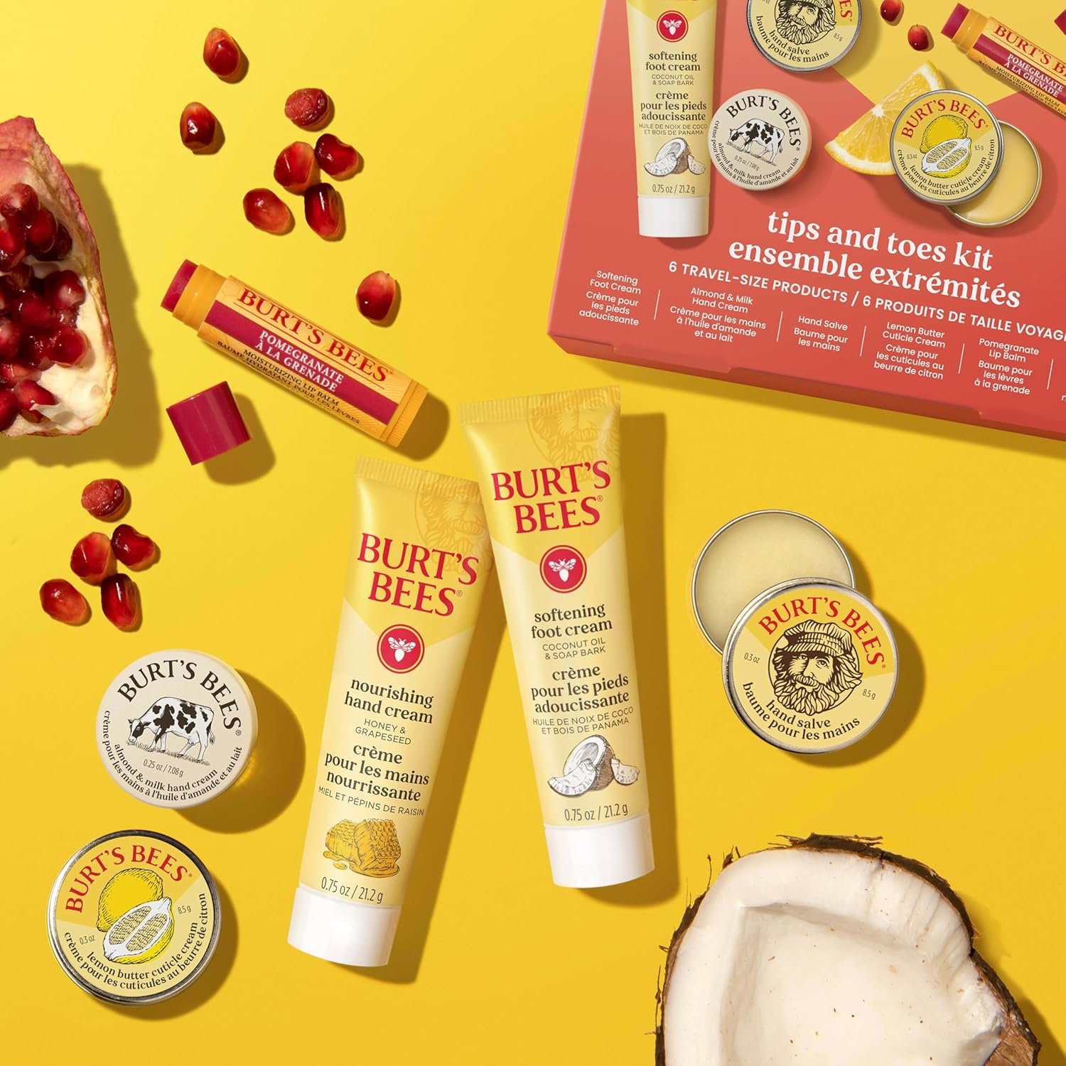 GIFT SET: One Burt’s Bees Tips and Toes Kit that includes six travel size skin care products, including foot cream, two varieties of hand cream, hand salve, cuticle cream and lip balm