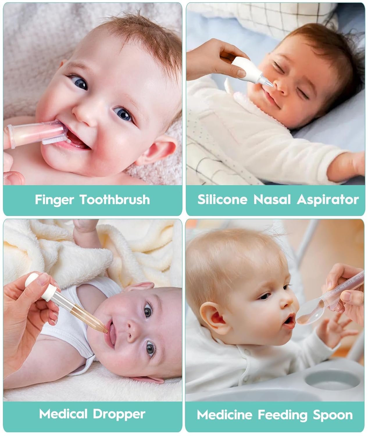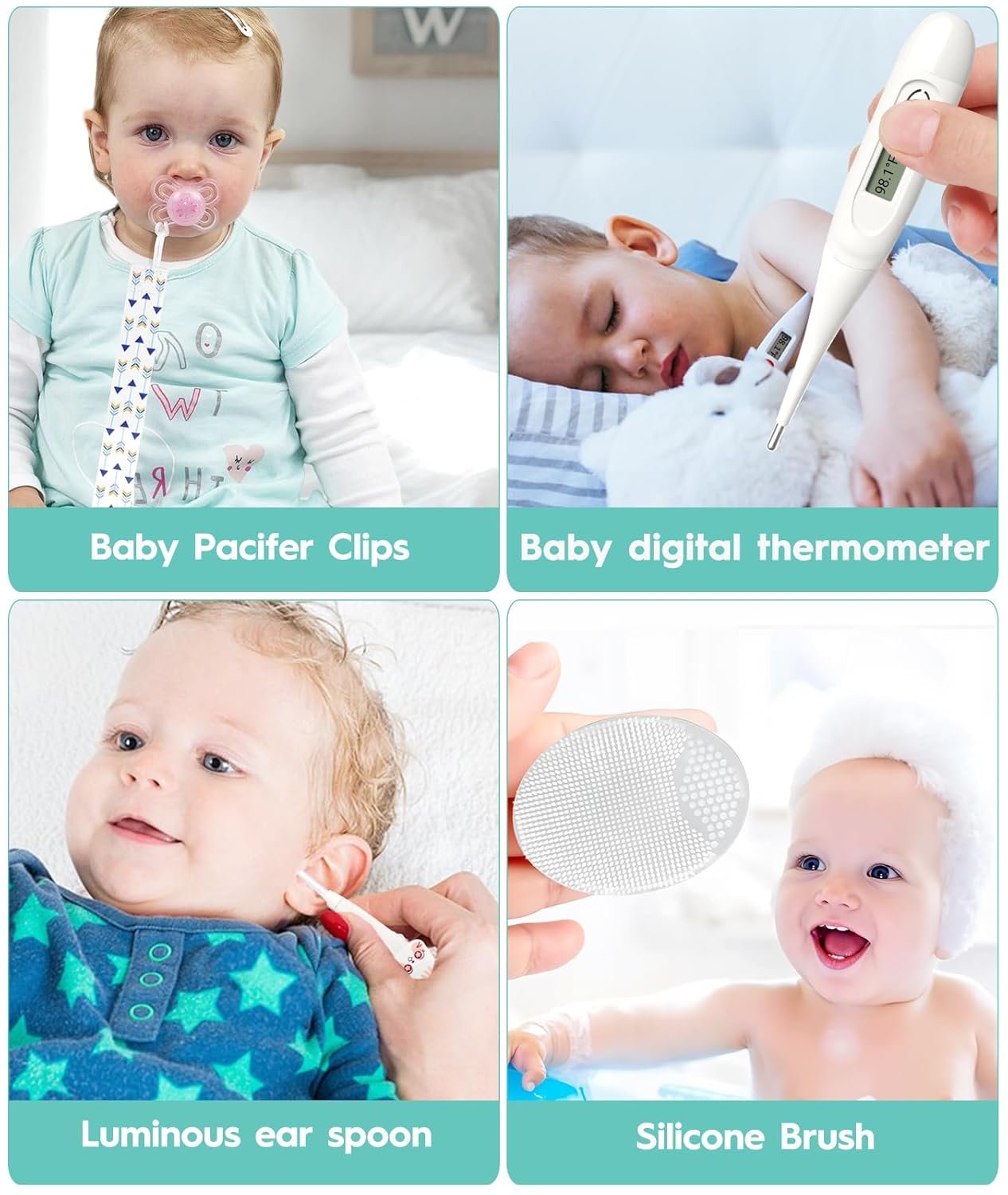 【Safety Designed for Baby】① Pacifier clip prevent Pacifier from falling on the floor getting dirty or lost. They are BPA Free, washable, and soft. ② Baby thermometer quick and accurate readings with a soft, flexible tip for comfort. ③ Scissors with round blades will not poke the baby ④With the scale on the medicinal feeding spoon and dropper, more accurate and easy to feed the baby. ⑤Nasal aspirator with small, flexible tip for baby’s comfort
