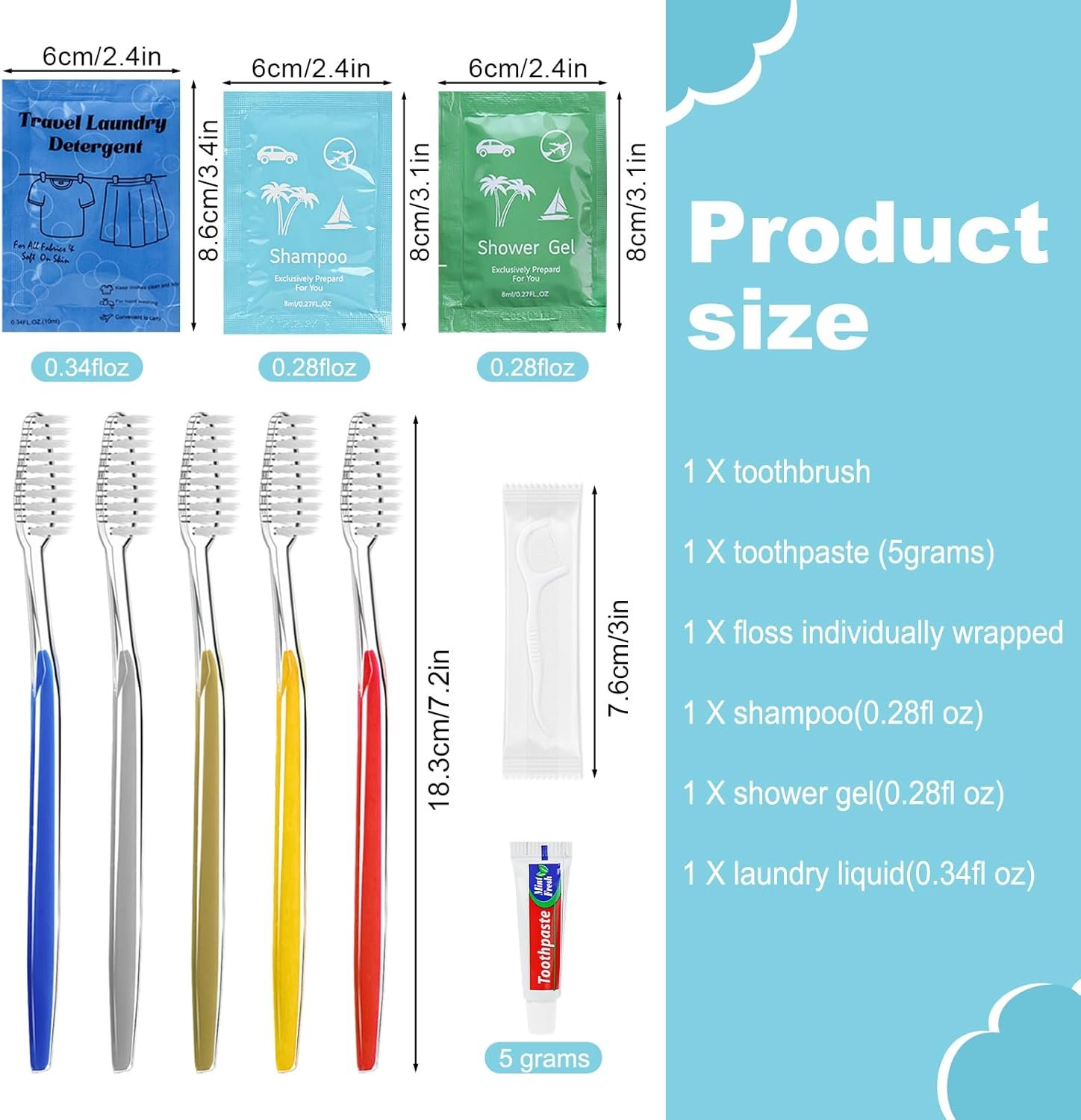 1.Bulk Hygiene Kit: the package comes with 20 sets of bulk hygiene supplies, including 20 bags of shampoo, 20bags of shower gel , 20 bags travel size liquid laundry detergent ,20 disposable toothbrushes with toothpaste and floss individually wrapped ,0.27fl Oz packet of shampoo and shower gel,0.34floz liquid laundry detergent,the packaging size : 2.3*3inch/6*8cm. There are a total of 5 colors of toothbrushes (red, yellow, blue, silver, brown)