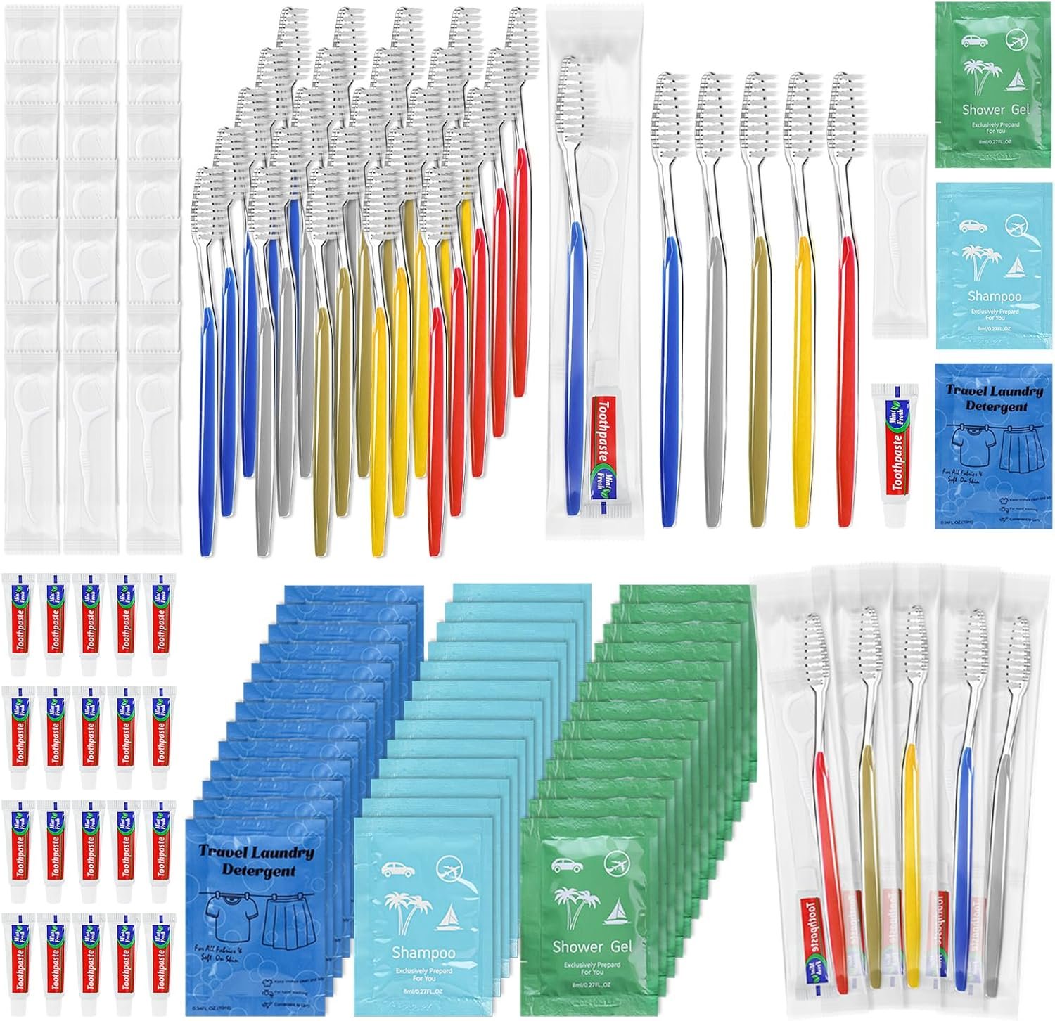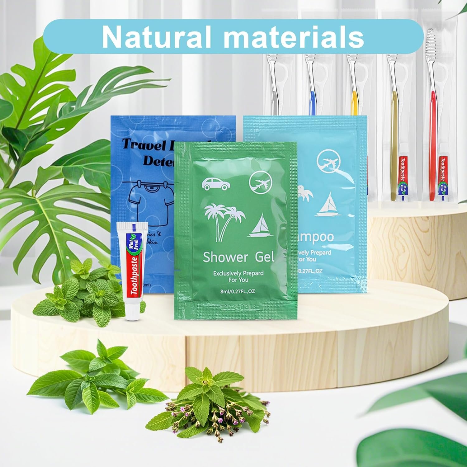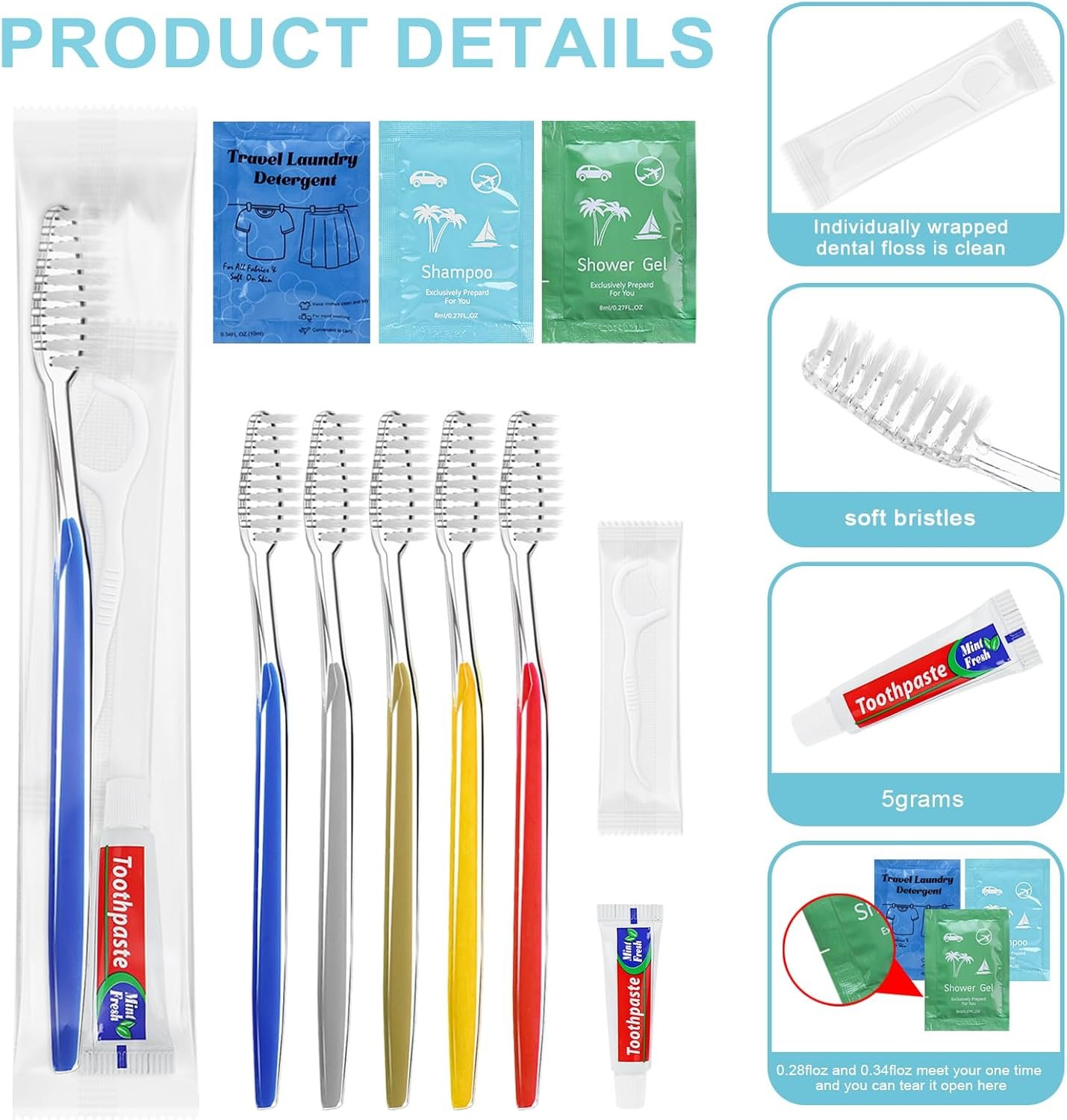 4.Ideal for Travel and Hotels :our travel toothbrush set is disposable toothbrushes bulk ,mini toopaste . Individually wrapped can maintain the hygiene toothbrushes.8ml of shampoo and shower gel ,10ml laundry detergent travel ,which is very lightweight and easy to carry and help control the amount used each time.They are perfect for those who are often on business trip or travel.