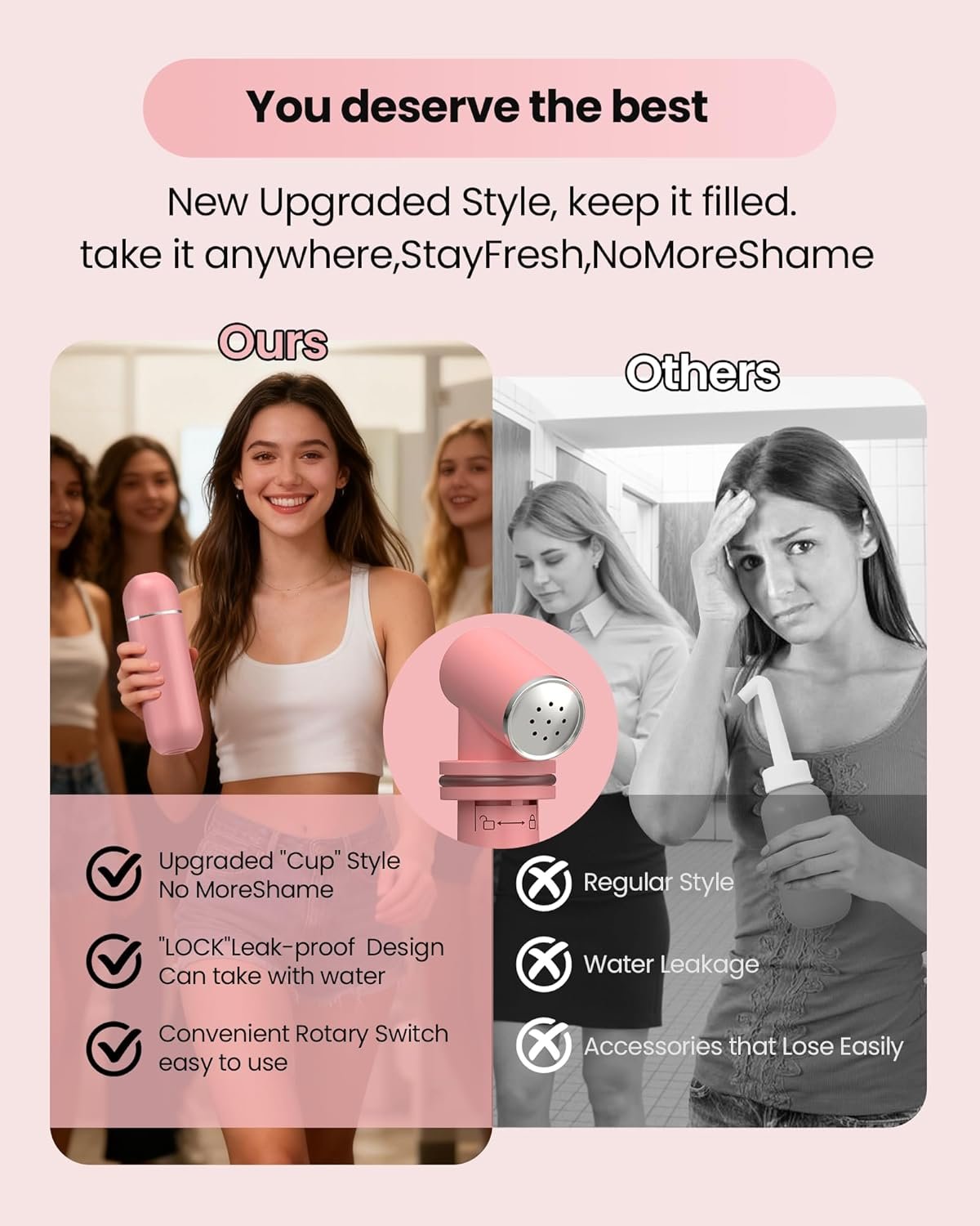 Portable water storage bidet:Pre-filled with water and can be fully filled and carried,convenient for travel.Anti-leakage safety switch ensures that there will be no leakage during carrying and use.The capacity of 380 ml/12.85 ounces is enough for one cleaning
