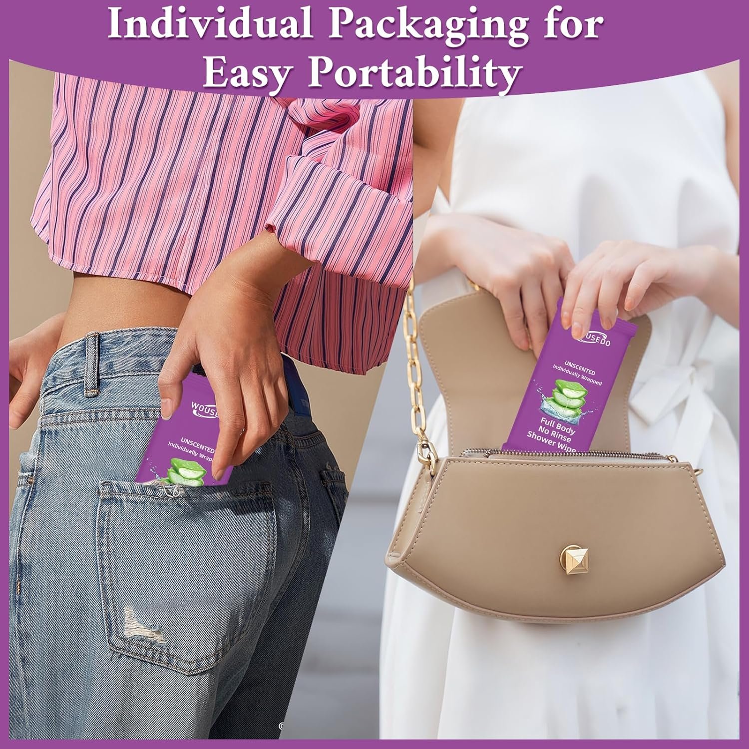 Individually Packaged:Each wipe has its own individual packaging,easy to carry and convenient to use.Nourishing the skin: Rich inAloe vera leaf juice and vitamin E.Unscented Body Wipes:Free from alcohol, any artificial flavors or chemical additives.High quality materials:Selected high-quality non-woven fabric as the base material for body wipes.
