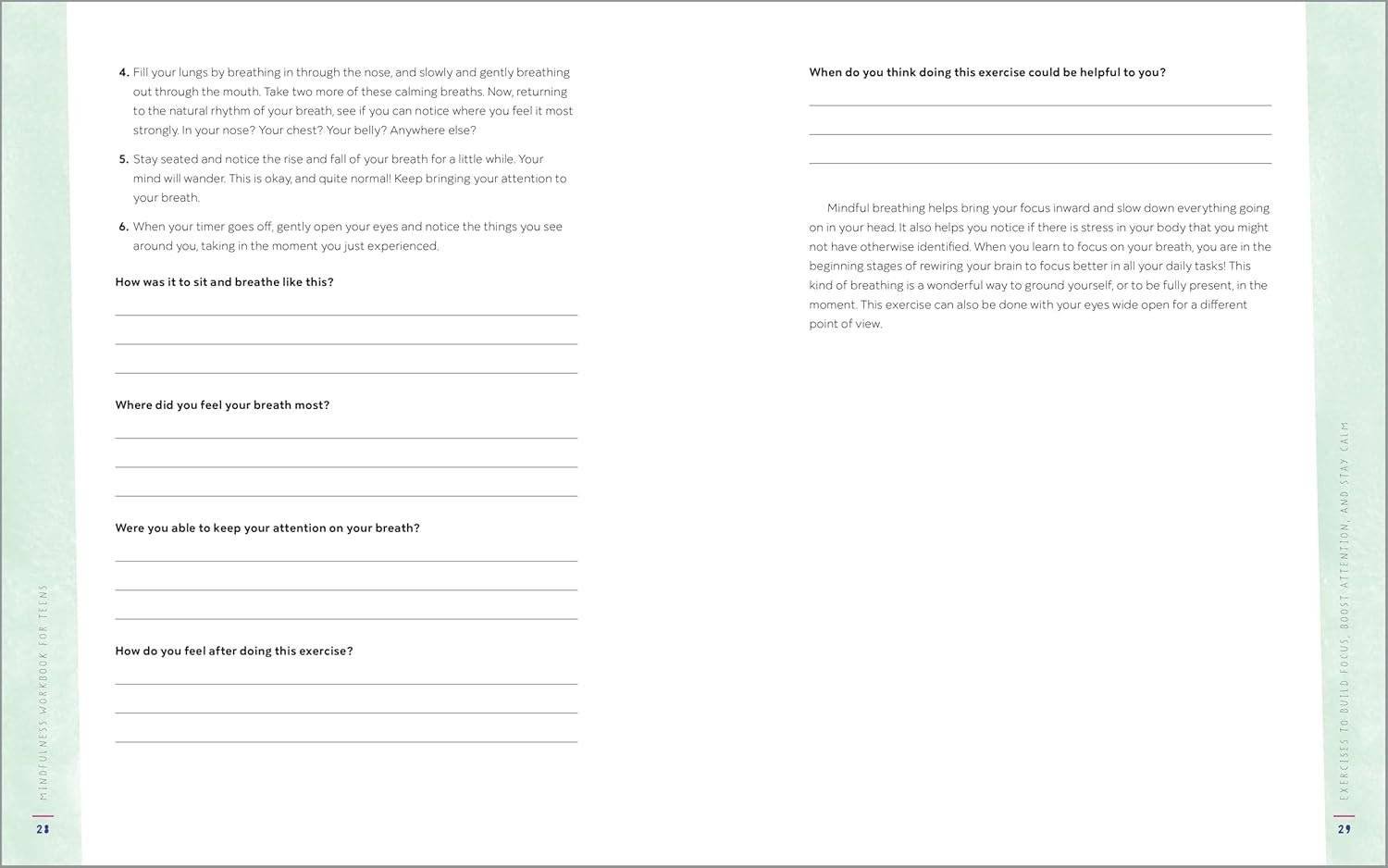 Mindfulness 101―Learn about what mindfulness for teens is (and isn’t), the changes that are happening in the teenage brain, the power of staying present, and beyond.Real-life scenarios―See how mindfulness for teens works in real life with strategies that are built around real situations you might be going through, like stress about your grades, the pressure to fit in and be liked, and more.Room to reflect―Get plenty of space to write about your experiences while you’re completing the activities so you can reflect on your growth.