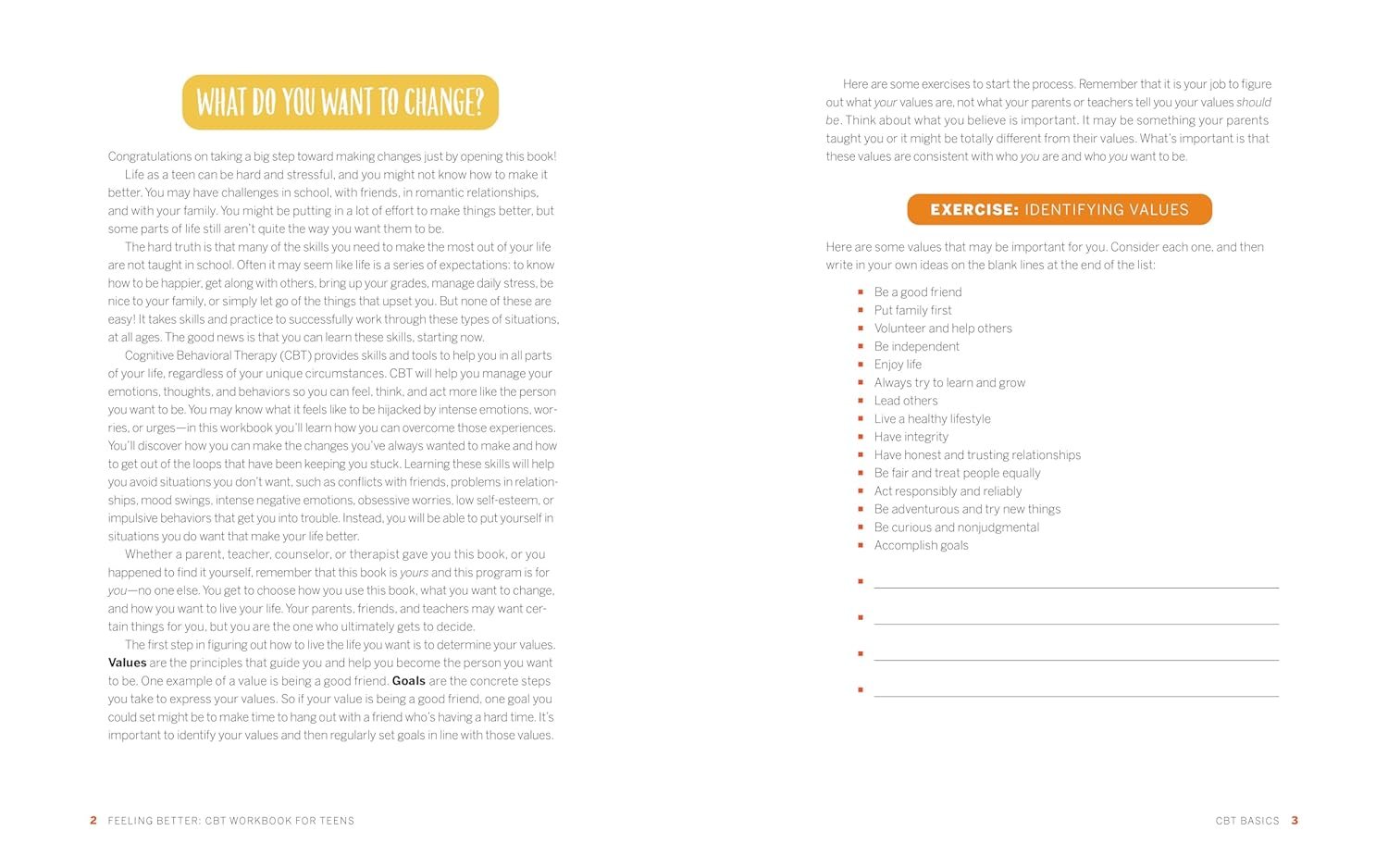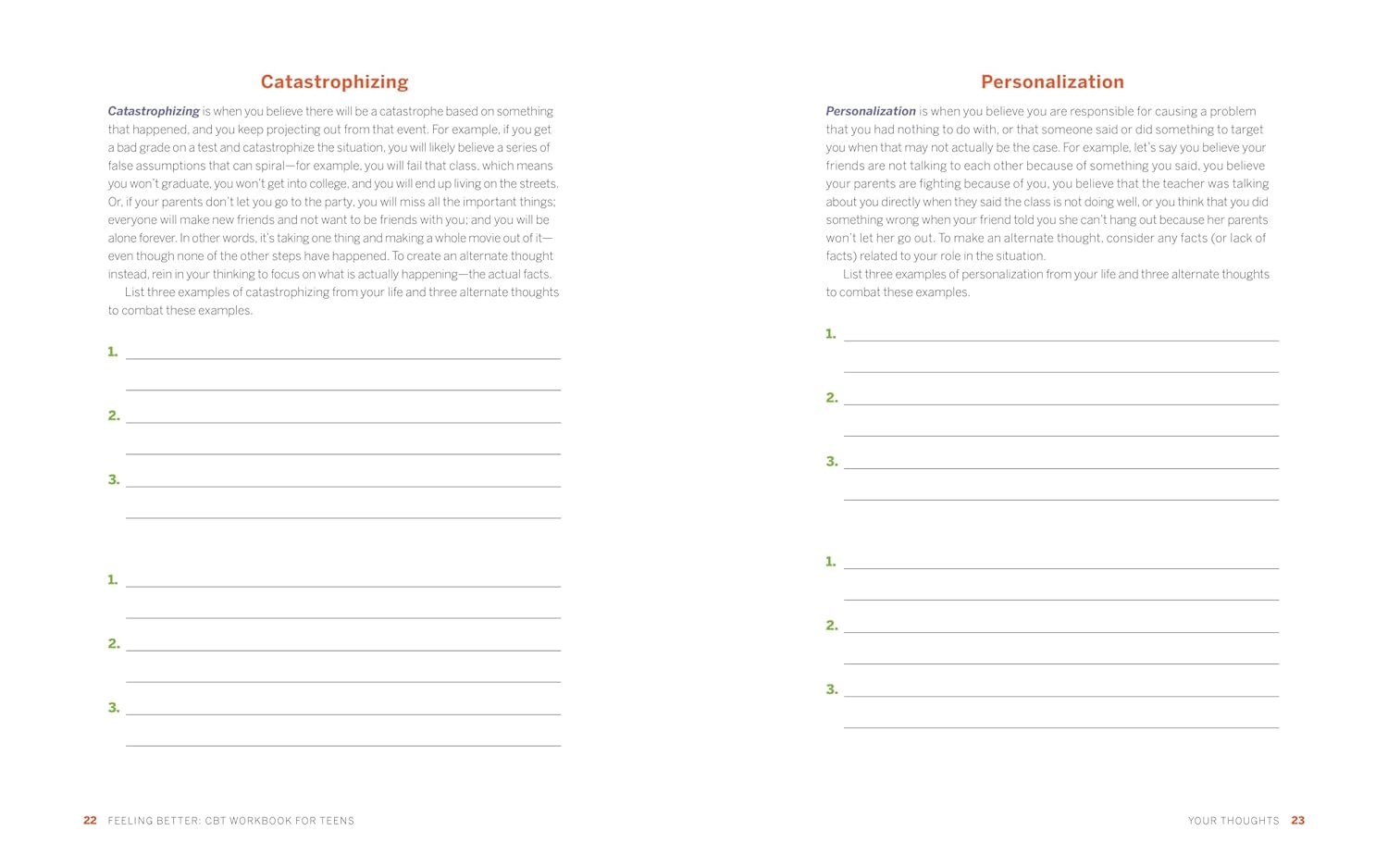 Dealing with school, friends, social anxiety, and thoughts of the future can be challenging for teenagers. This CBT workbook for mental health skills can help, with strategies for overcoming tough feelings and living with more positivity and optimism. Find activities and writing prompts that will help you determine your values, boost your self-esteem, and learn to let thoughts come and go without getting stuck on them.