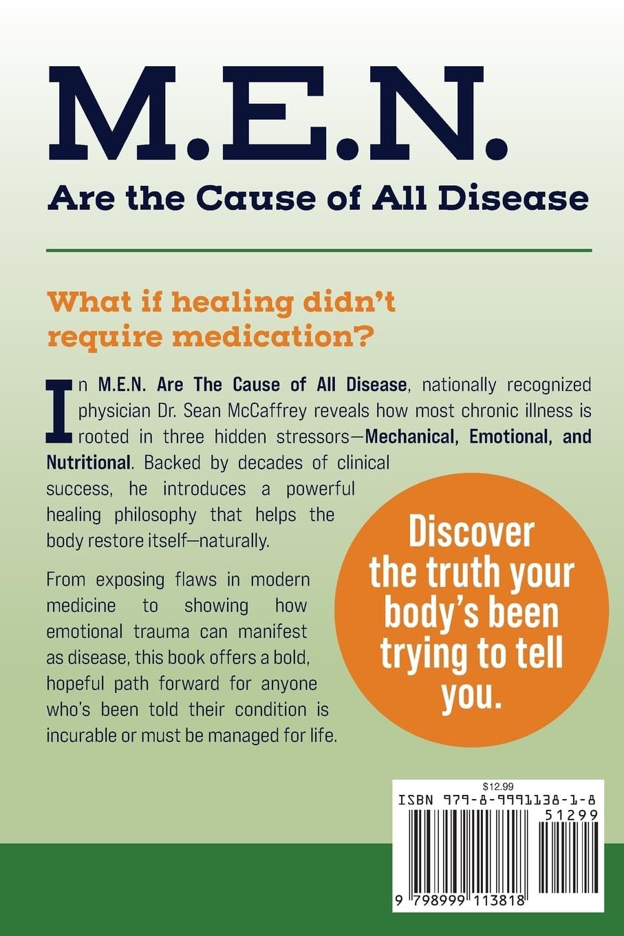 This is not your typical health and wellness book. In M.E.N. Are The Cause of All Disease, nationally recognized physician and founder of one of the Midwest’s only fully integrated wellness clinics, Dr. Sean McCaffrey, delivers a powerful, paradigm-shifting message: most chronic disease stems from three hidden stressors—Mechanical, Emotional, and Nutritional.