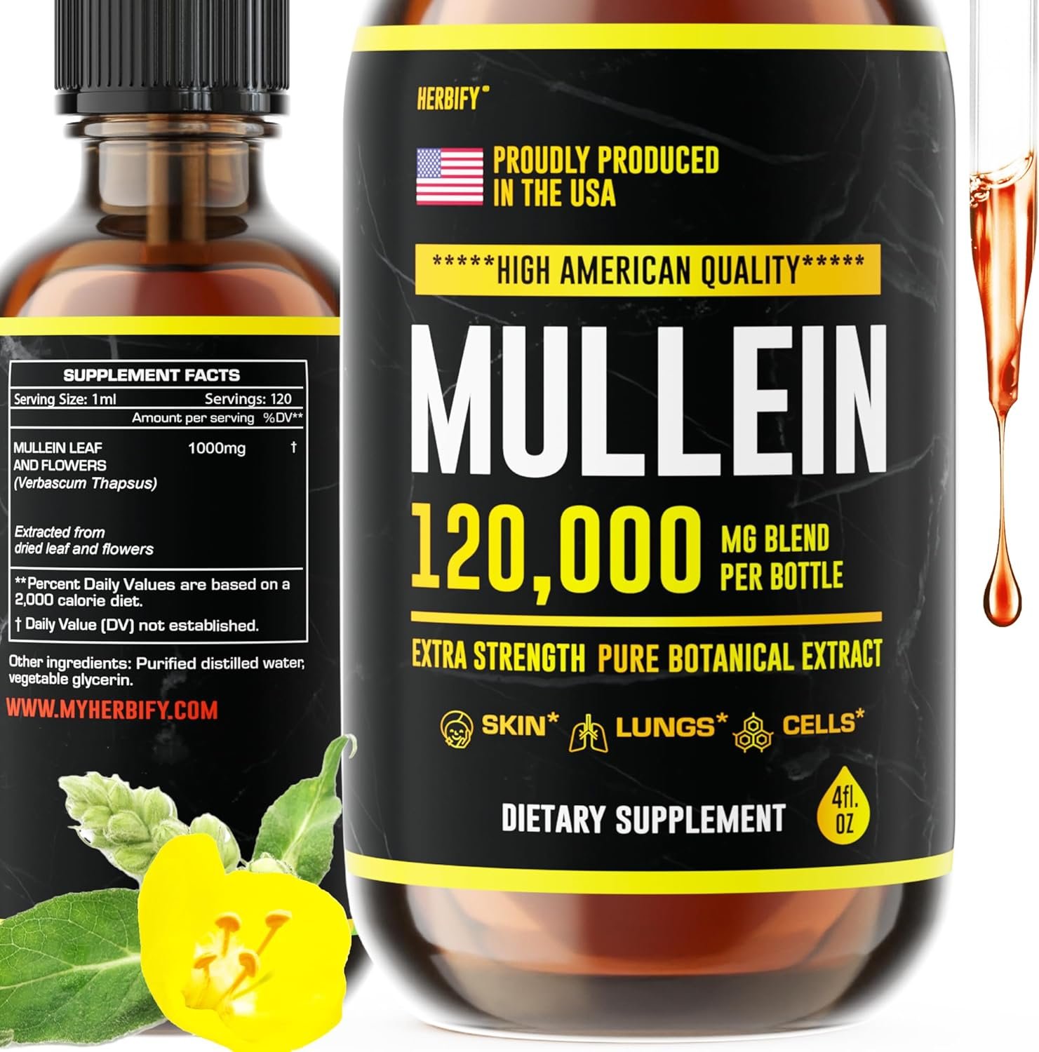 Pure mullein leaf and flower extract from Herbify is very close in effect to Echinacea. Our Mullein tincture supports lung cleansing. Absolutely essential product for smokers and health conscious people. Mix it with water and support healthy breathing.