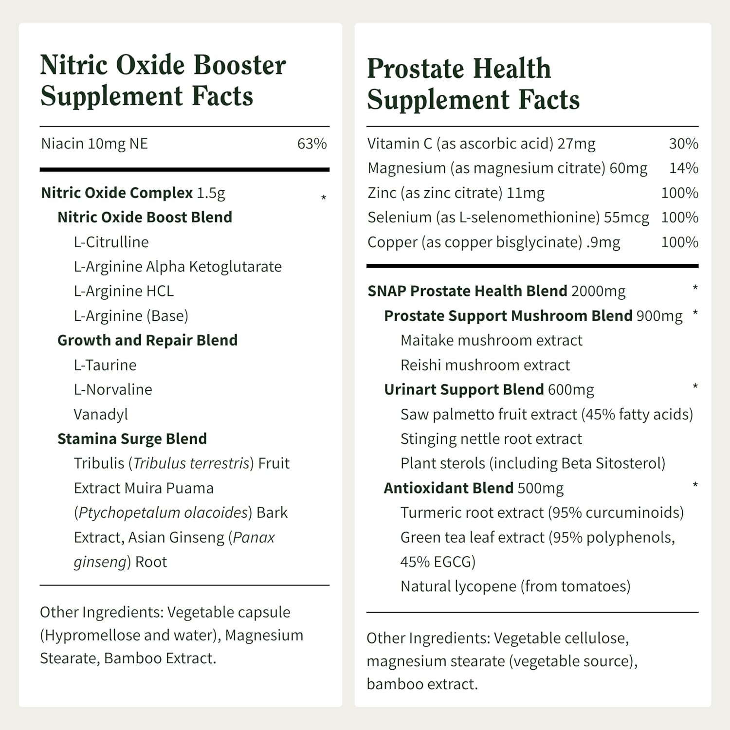 Dual-Action Wellness Support For Men: This complete two-bottle set includes our Nitric Oxide Booster with ginseng root to support circulation, stamina, daily vitality, and natural energy – without stimulants or added sugars – plus our Prostate Health formula with saw palmetto, nettle root, and plant sterols (including beta sitosterol) to support urinary wellness, prostate health, and healthy immune function.