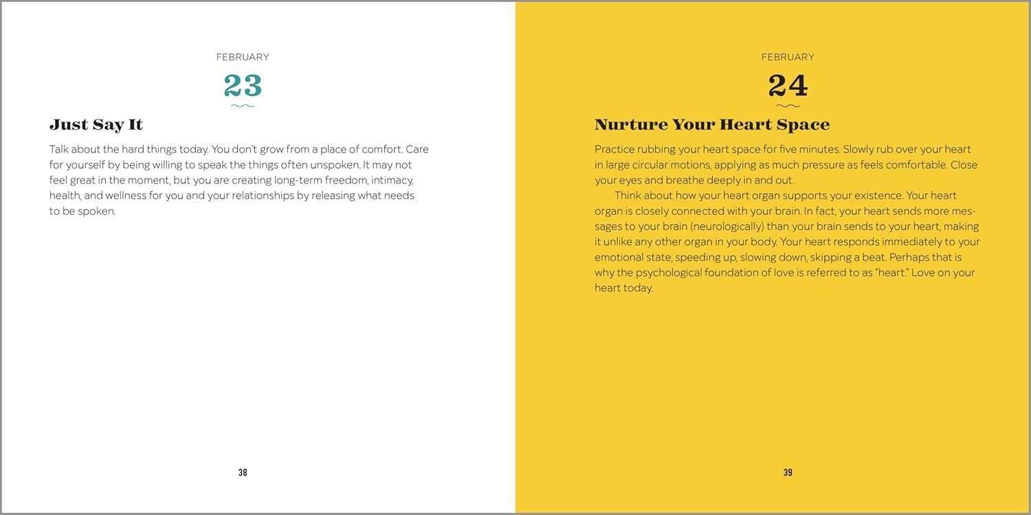 Bite-sized self-care tips―These 15-minute motivational exercises make it easy to stick to a routine no matter how busy you are. That’s 91 hours of self-care over the course of a year!Supportive strategies―Research-backed exercises include writing down what gives you gratitude, nourishing your heart and soul by creating a playlist of music that touches you, and more.Daily practice―After practicing self-care every day for a year, you’ll be empowered with the knowledge and tools to continue the journey on your own.Spread the (self) love―Give this book as a a meaningful holiday gift and set everyone in your life on the path to greater self-love!