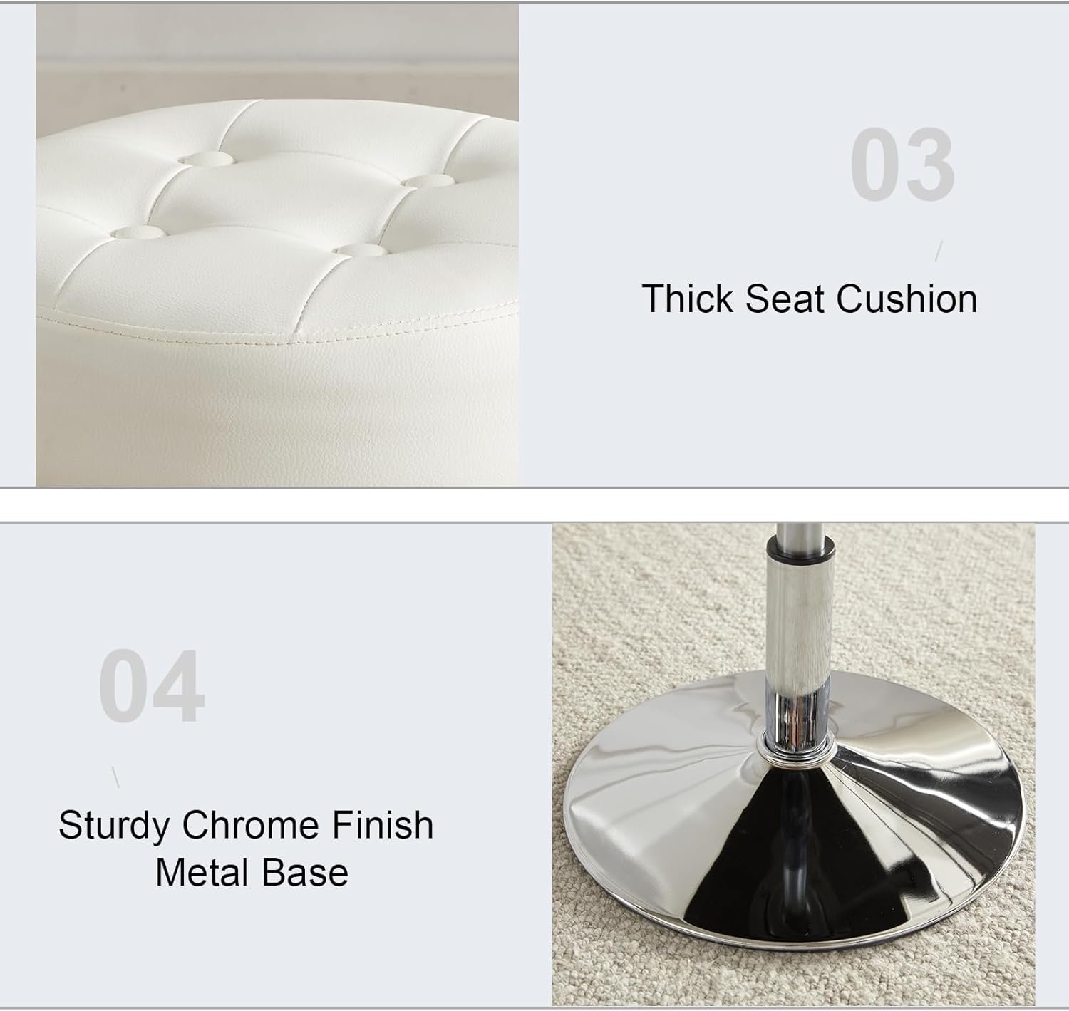 Size: the round leather ottoman has Φ13 inch Wide Seat; Height adjustable from 15.8 inch to 20.5 inch, Metal Base makes makeup vanity chair vanity stool for makeup room more stable. weight limit/capacity:300LBS. Easy to install this vanity stool bathroom in only 5 minutes.