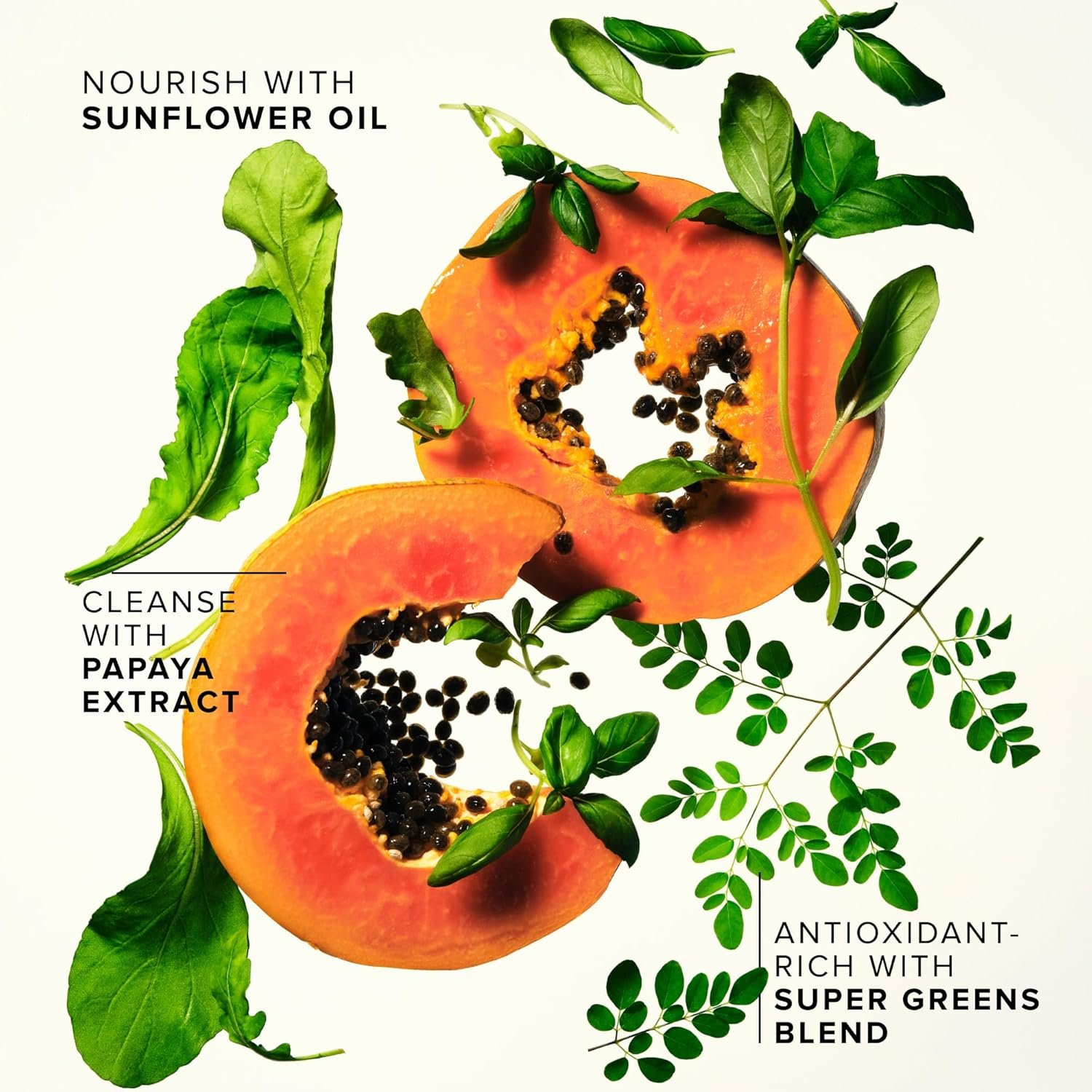 Farm to Face Ingredients – A double cleanser that’s greener, cleaner and better than makeup wipes, powered by plant-based waxes + a farm-grown super greens blend of upcycled moringa, holy basil + arugula.