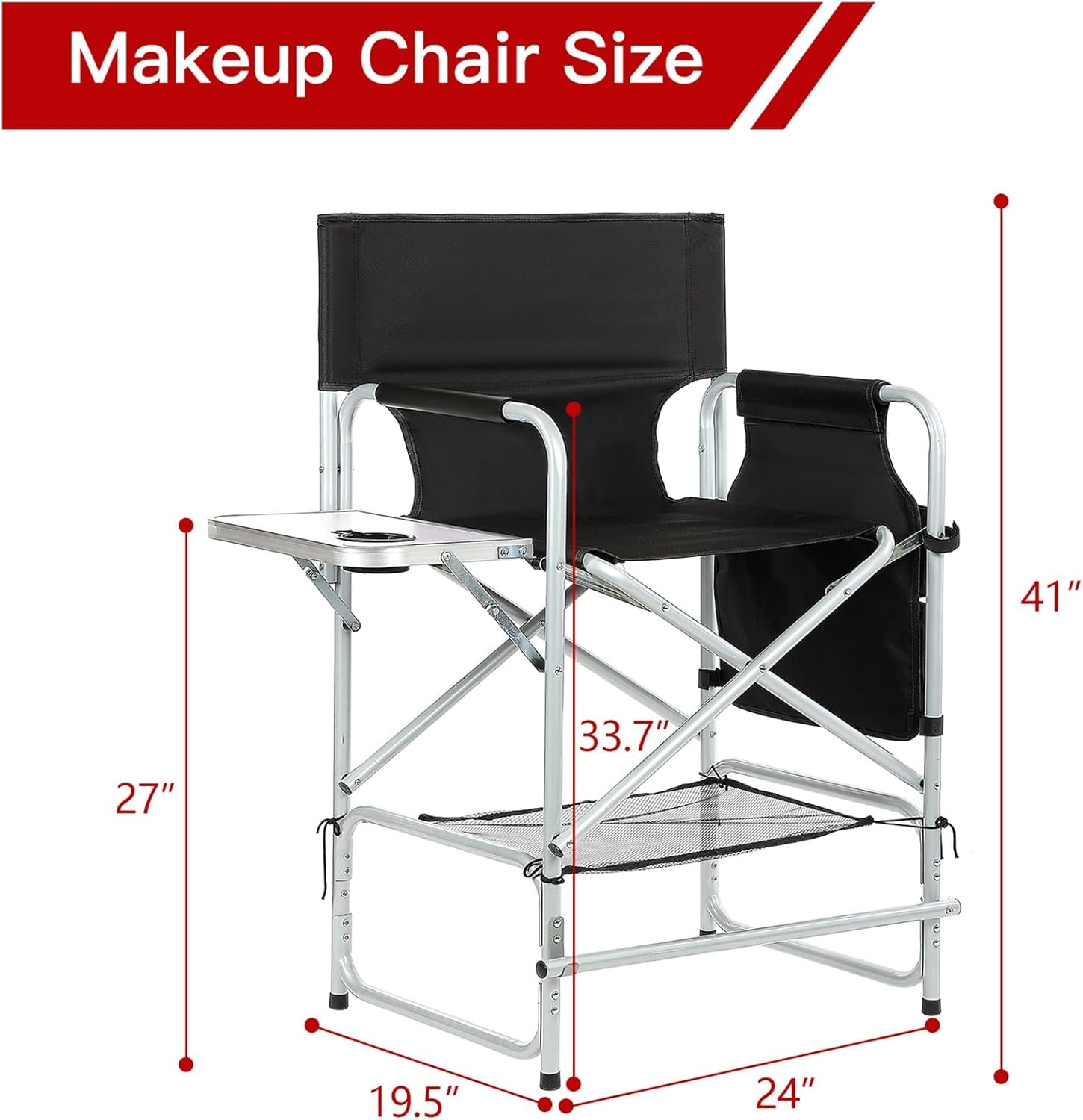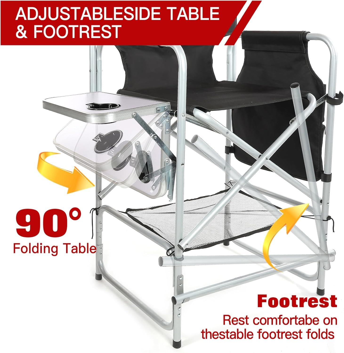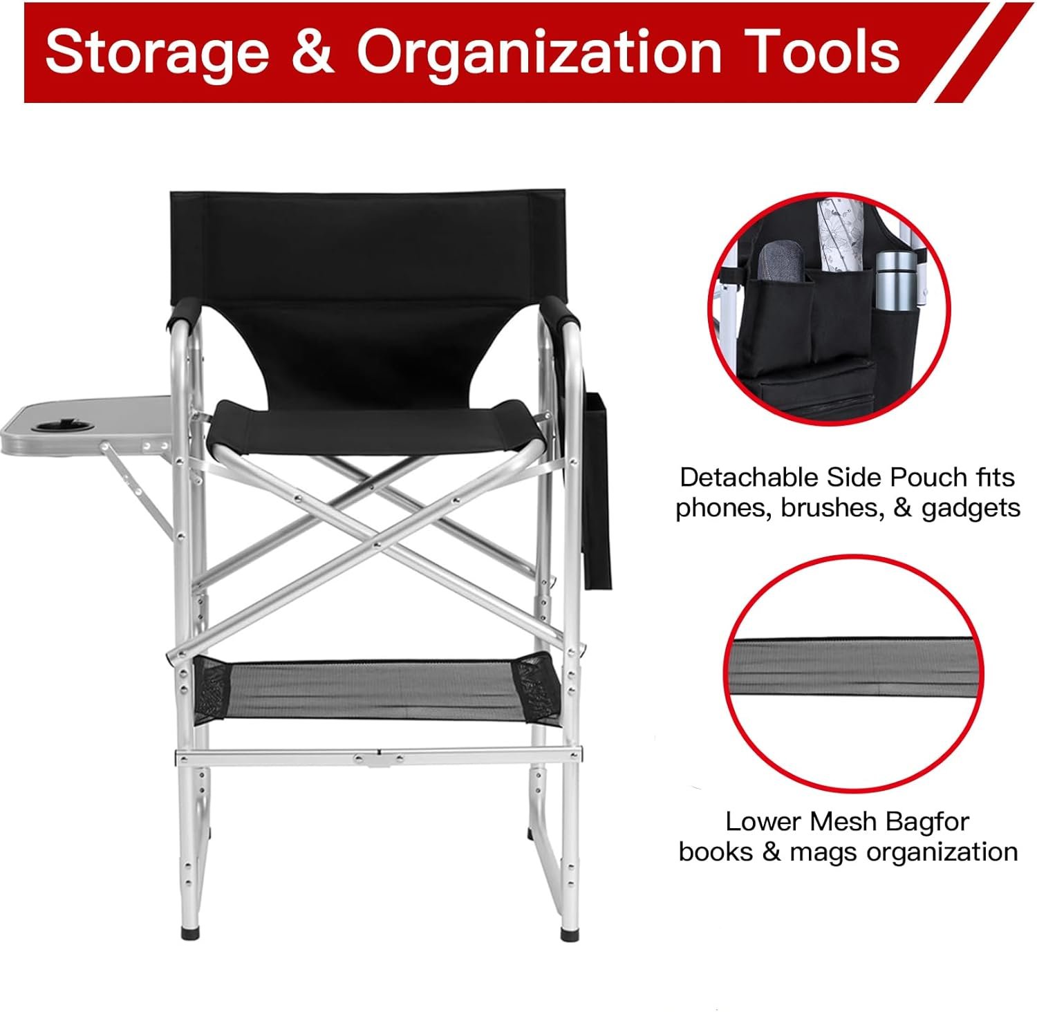 RETRACTABLE SIDE TABLE & SIDE POCKETS: This tall directors chair features a side table with built-in cup holder, also a side accessory pocket attached to the other side of the chair, so you can keep your drinks, phones or cosmetics, also convenient for makeup artists to keep makeup case and brushes