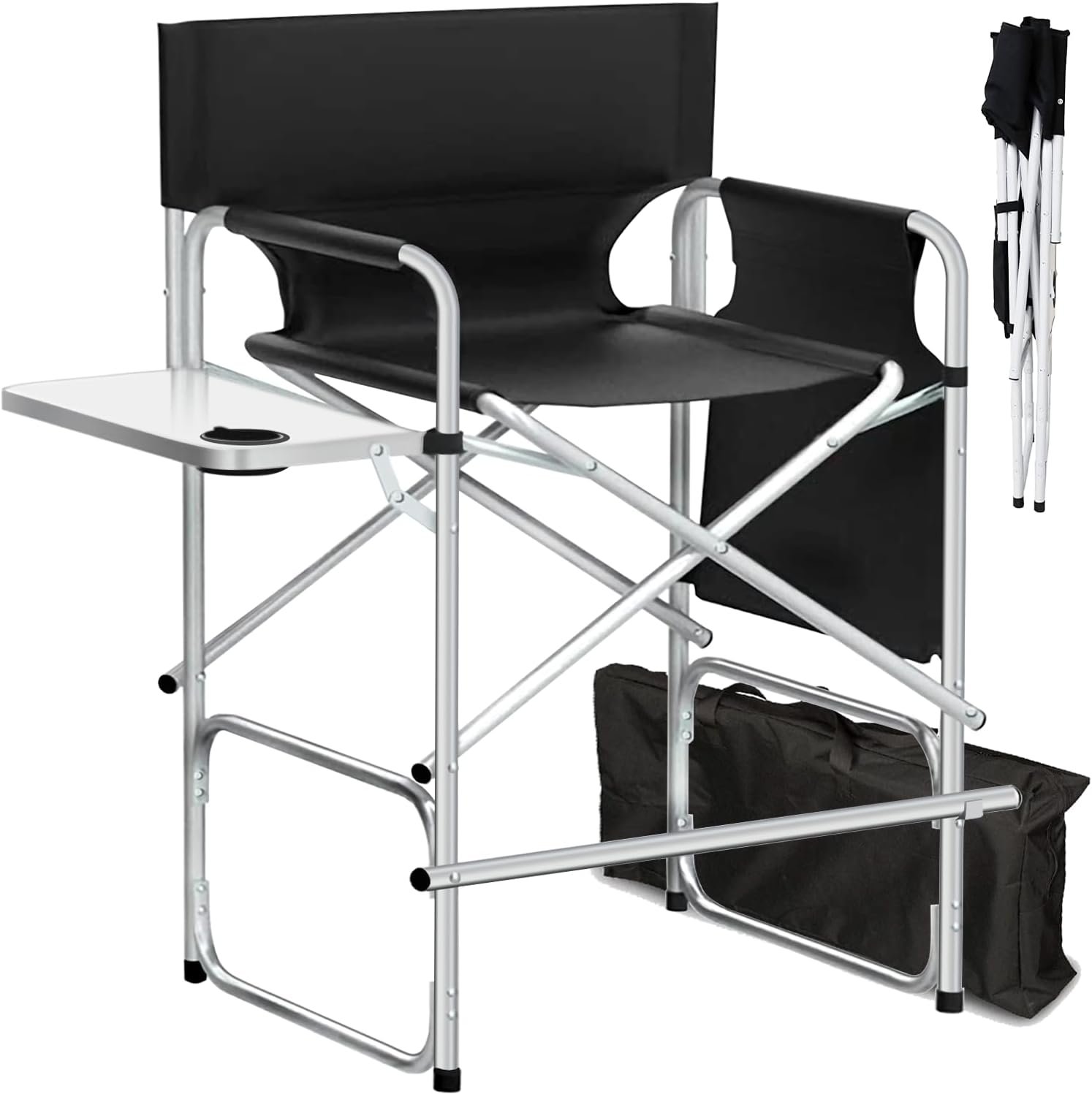 Our tall director chair has a side table, a cup holder, a detachable storage bag, and a footrest. When outdoors, you can put snacks and drinks on the cup table. As a makeup artist chair, you can put your cosmetics in a detachable storage bag for easy access. At the same time, this camping chair has footrests, so you can easily place your feet, which is solid and firm!