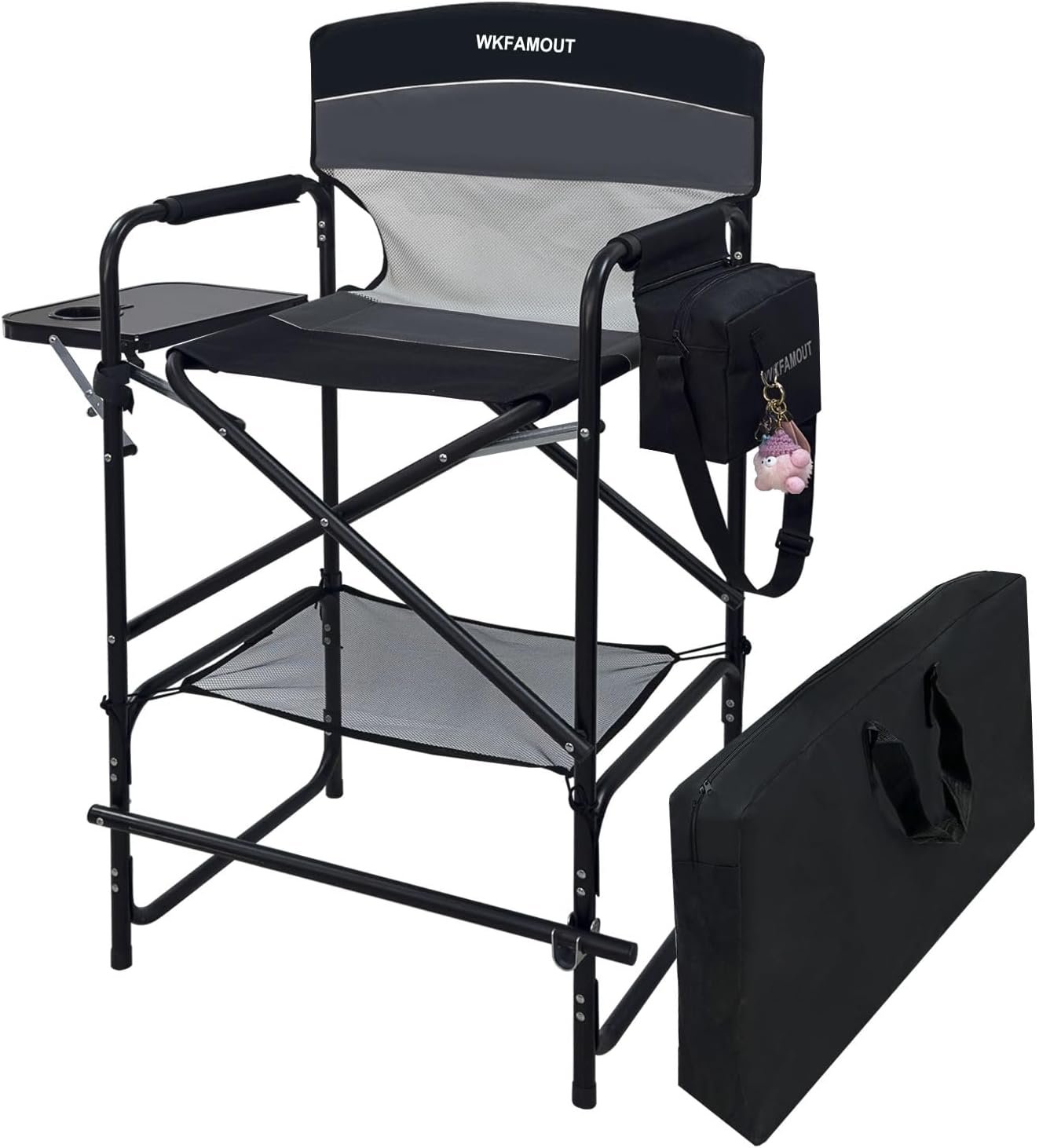Humanized Design: Equipped with a table and built-in cup holder, this chair keeps essential items like phones and drinks within easy reach. It’s also convenient for makeup artists to store makeup cases and brushes. Additionally, the folding director’s chair features a steel footrest for comfortable foot relaxation, which can be half-detached for side fixing.