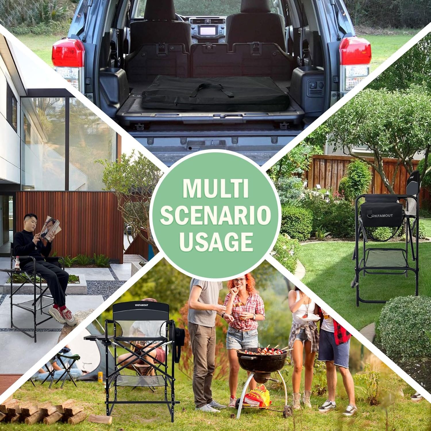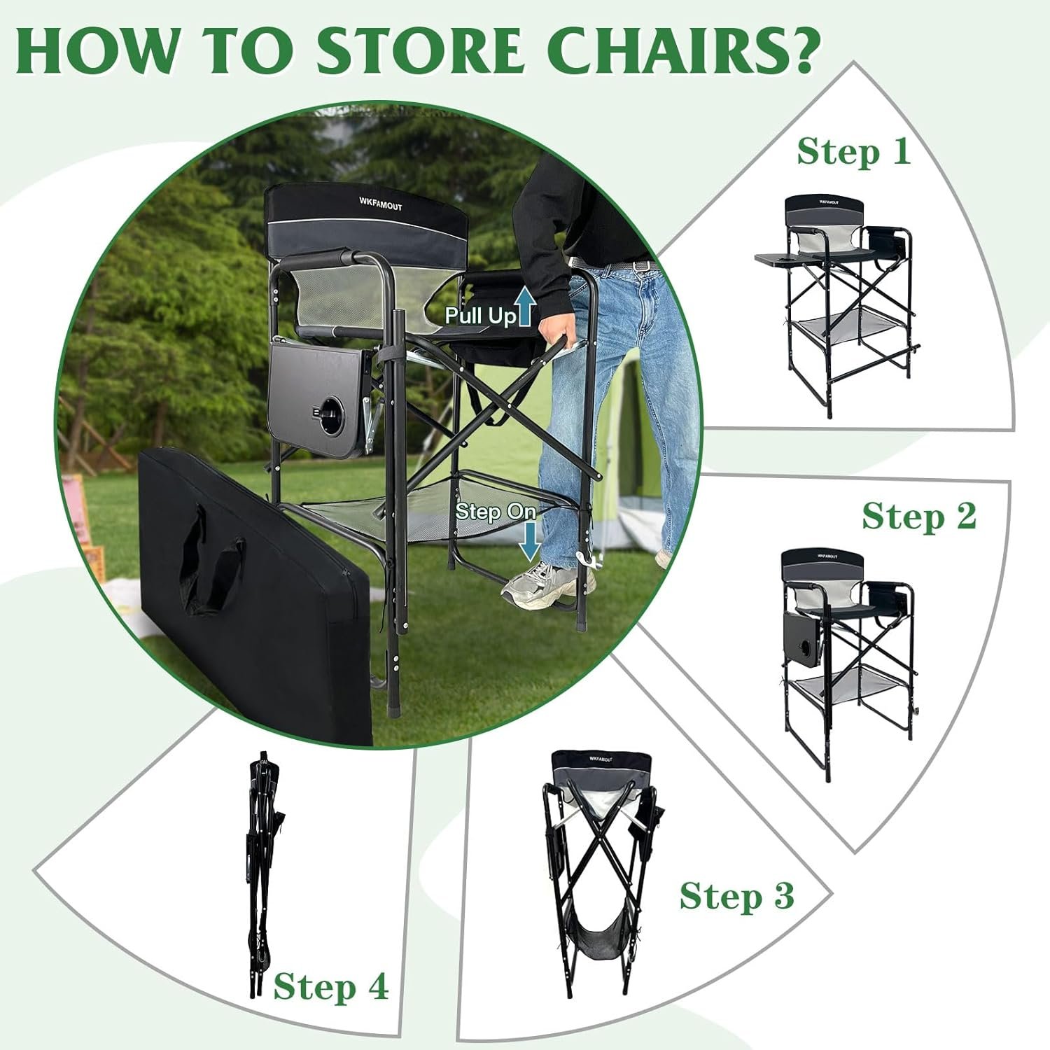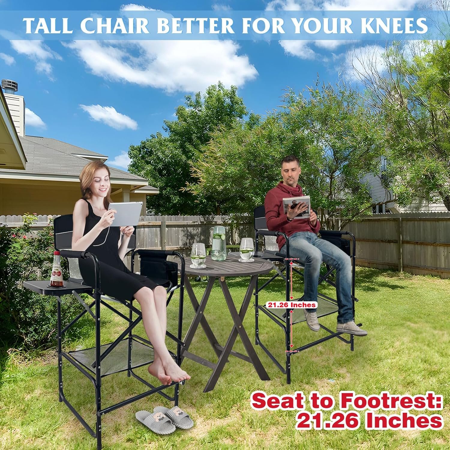 Big and Tall Folding Chair: Featuring a reinforced steel frame, this folding tall director’s chair effortlessly supports up to 250 lbs. The chair’s dimensions when unfolded are 47.24×24.4×21.26 inches, providing a comfortable seating experience with a tall seat height of 30.7 inches.