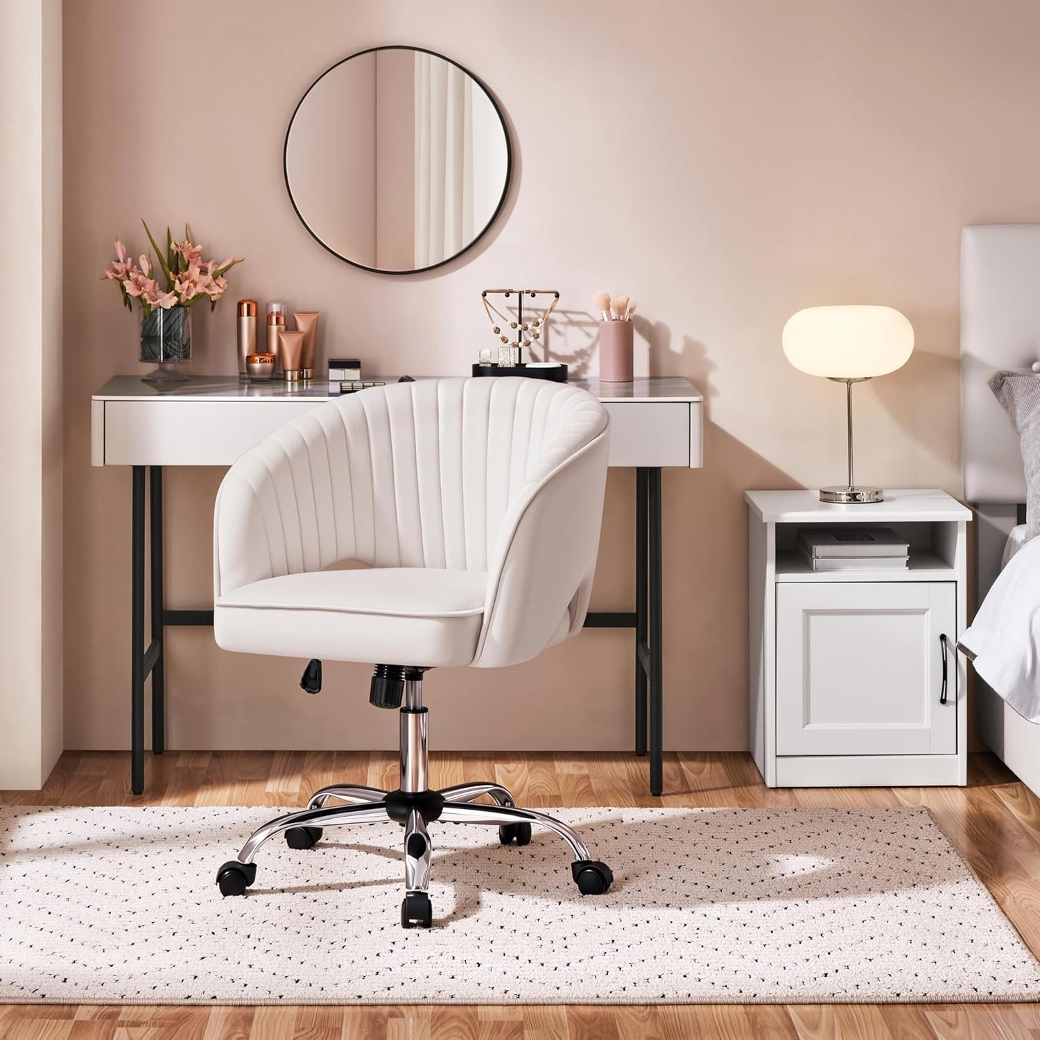 Comfy Mid Back Desk Chair: This velvet office chair features an upholstered seat stuffed with thick dense foam and enveloped in soft-to-the-touch velvet fabric, which is soft and cozy to sit on. The padded, barrel-shaped backrest cradles your body to relieve waist pressure and back fatigue, while cutouts on the back improve airflow for a cooler feeling. The curved armrests fit flawlessly with your arms, optimizing the sitting experience