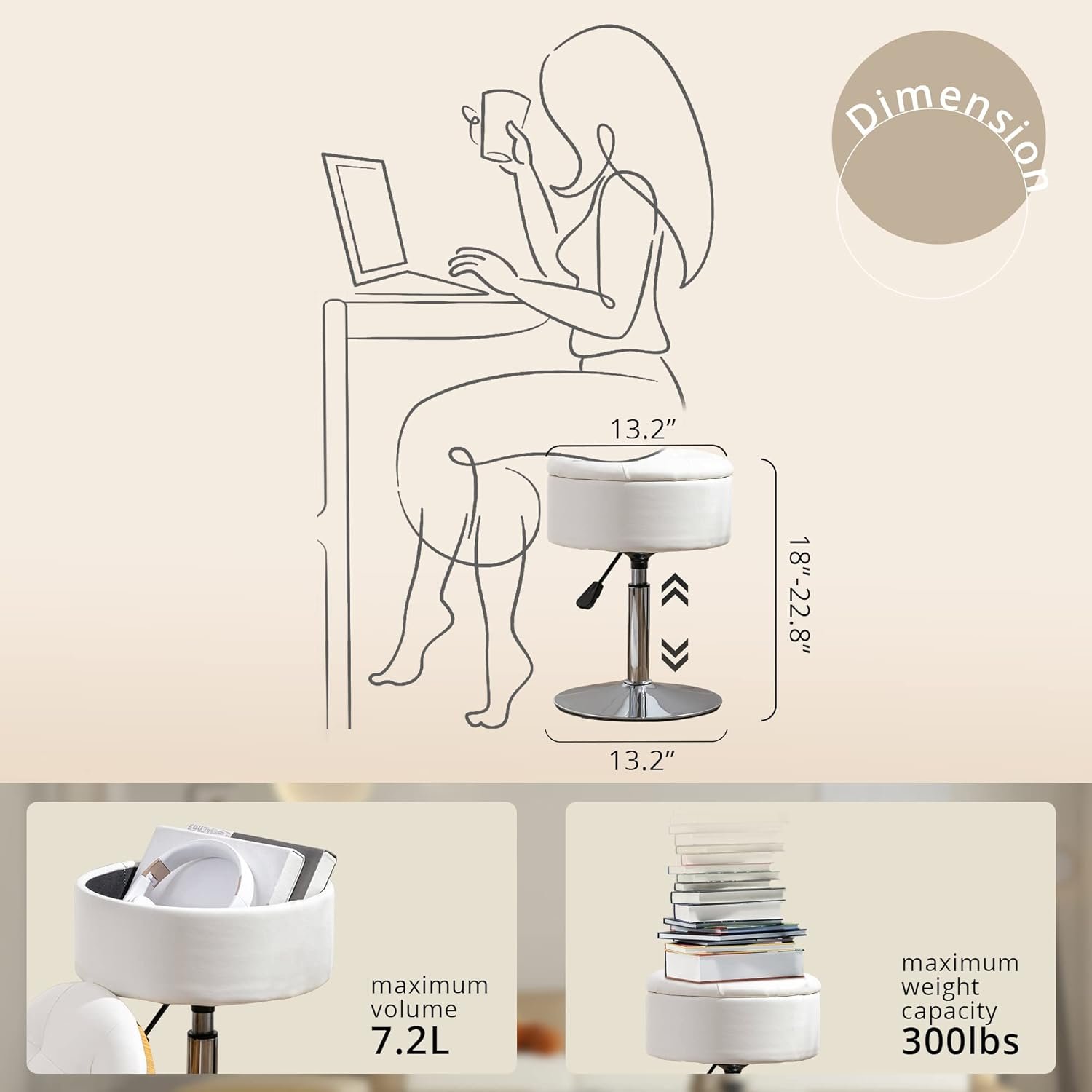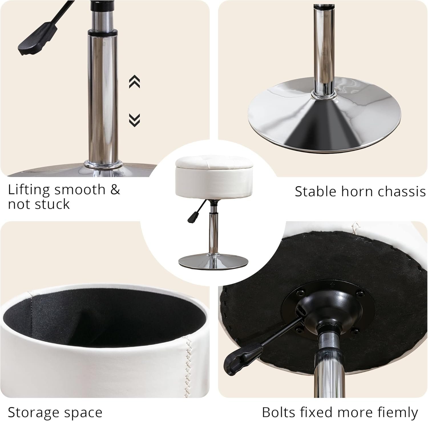 Height Adjustable and 360° Swivel: The vanity stool adjusts from 18.1″ to 22.8″ and swivels 360° to accommodate various dressers; The large circular metal base provides stability and prevents tipping or shaking