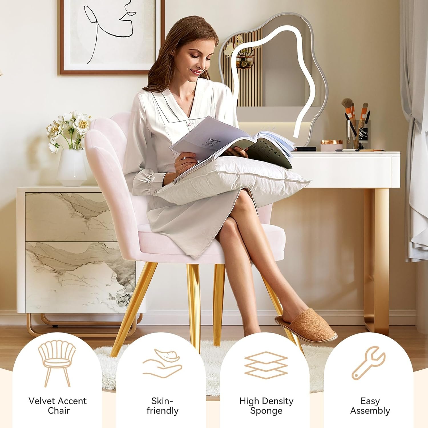 【Elegant Velvet Chair】Featuring a shell-shaped design, graceful curves, and soft velvet upholstery with golden legs, this vanity chair exudes style and classic elegance. Ideal as a guest chair, vanity chair, or side chair, it brings cloud-like softness and a luxurious touch to any room.