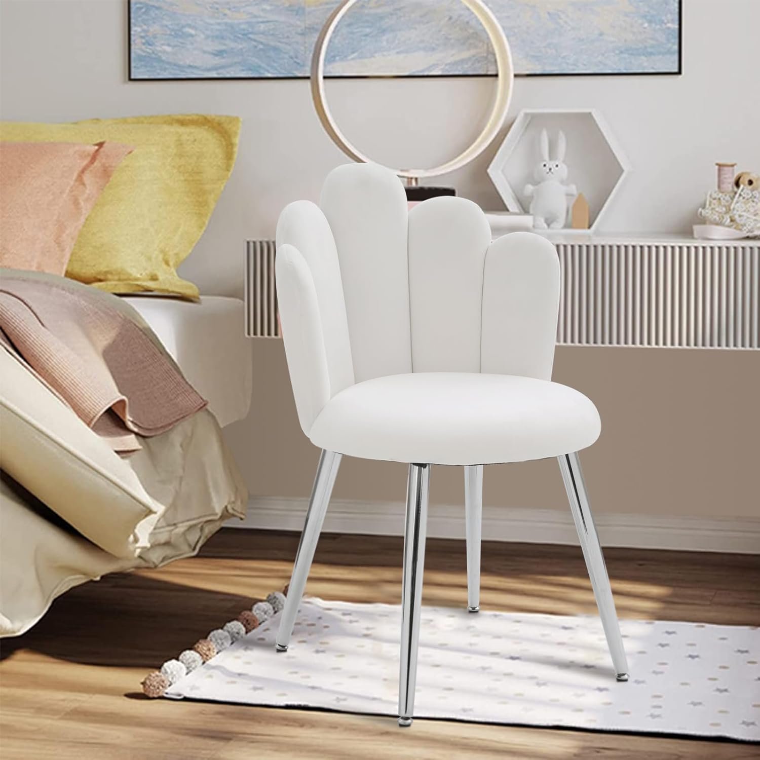 【Elegant Design】The elegant backrest of living room chair is seashell-shaped for a luxurious look, while the gold-finished tapered metal legs for a retro flair. Put the vanity chairs with backs in your living room, grab the attention of your guests at the first time.