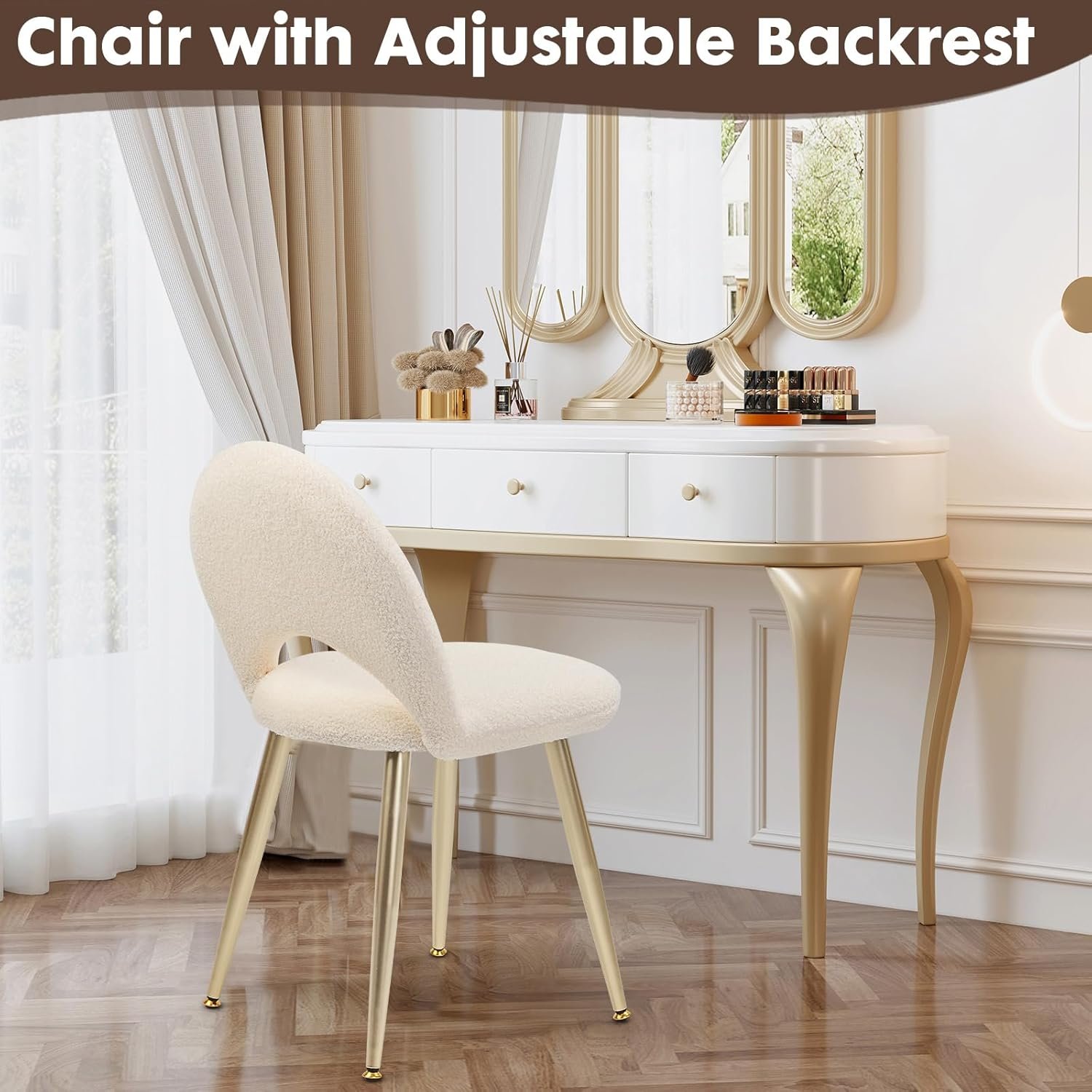 ADJUSTABLE & ERGONOMIC BACKREST: The back of the vanity chair is adjustable in five positions. The U-shaped ergonomic design offers excellent back support by redistributing weight away from the spinet, make you comfortable for make up or skin care