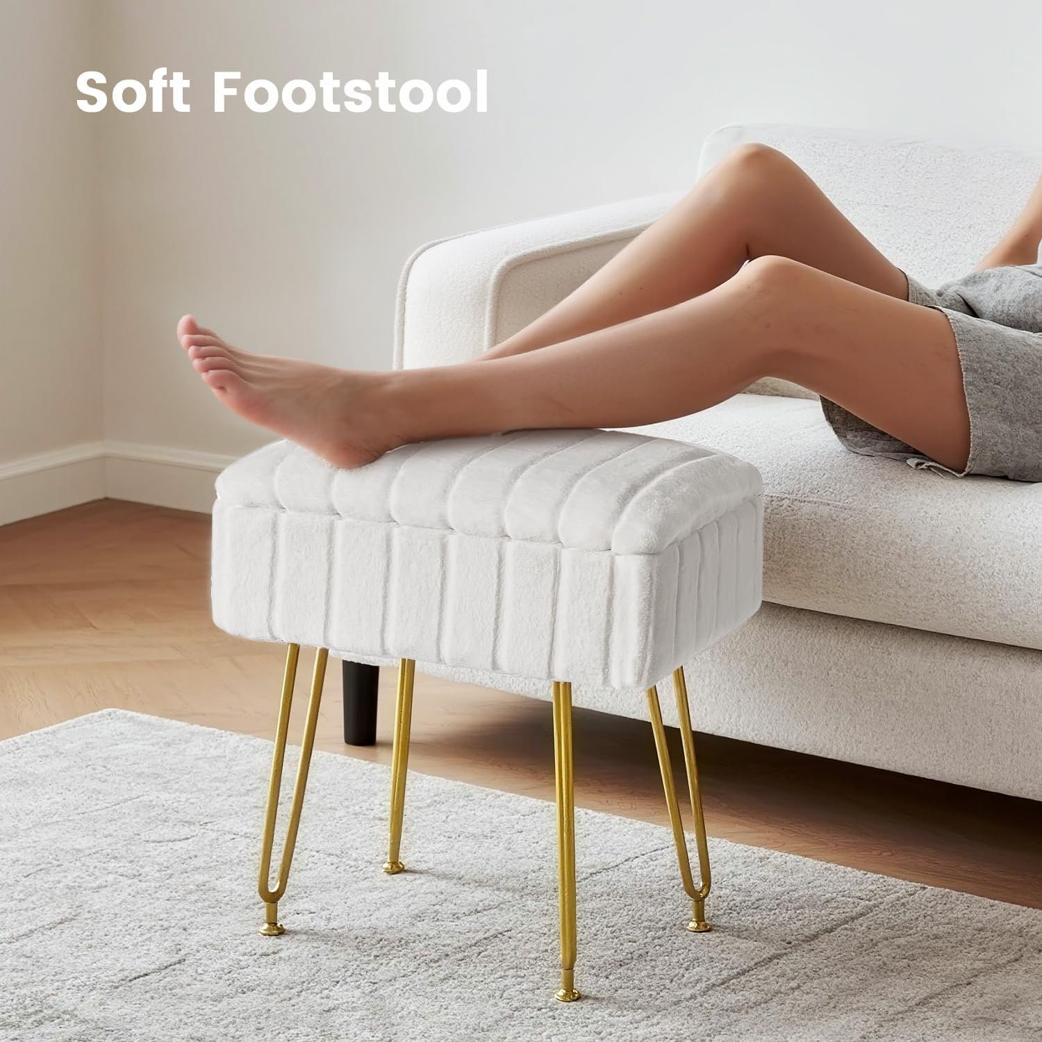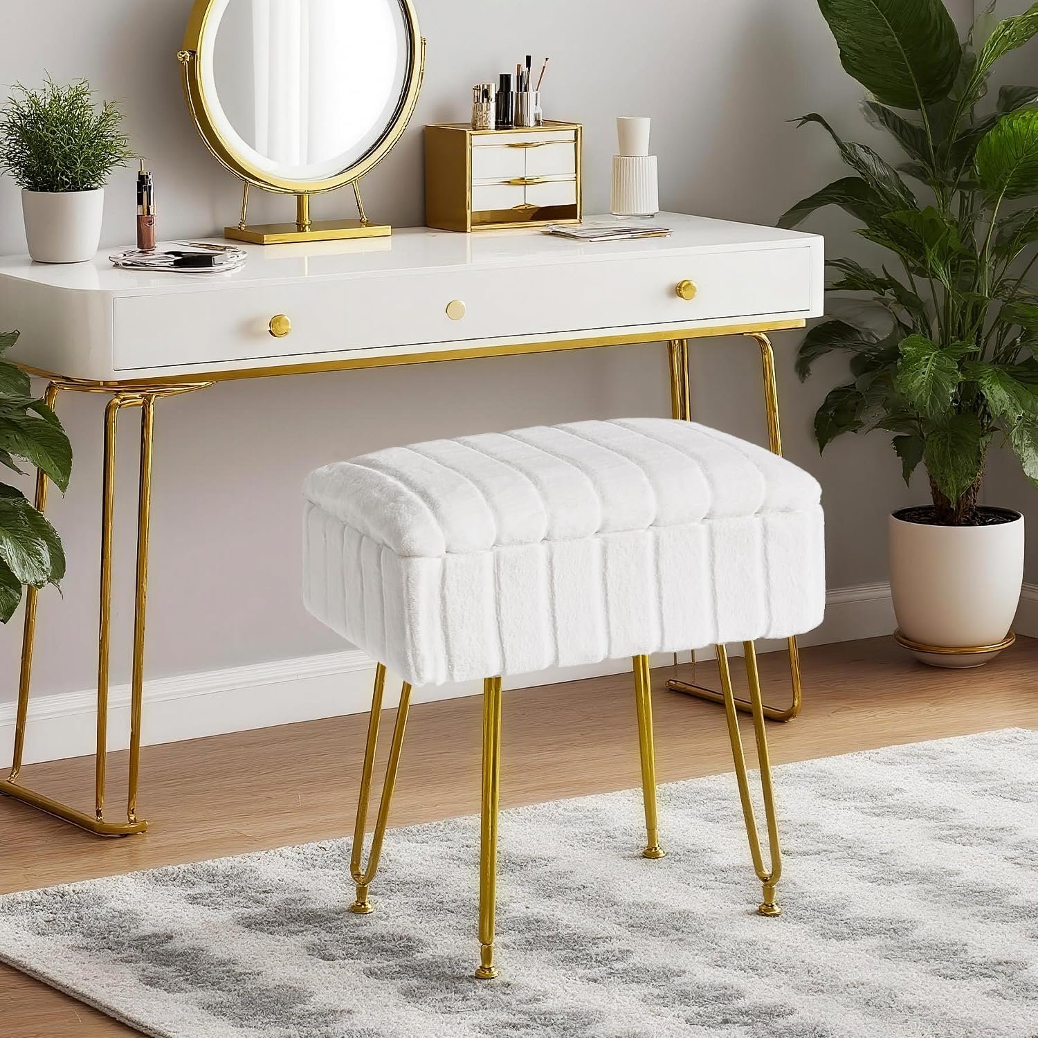 Soft Faux Fur Upholstery: Covered in luxuriously soft faux fur, this ottoman feels like sitting on a cloud. The plush, cozy surface is gentle to the touch, providing comfortable support whether you’re using it during makeup sessions or relaxing your feet