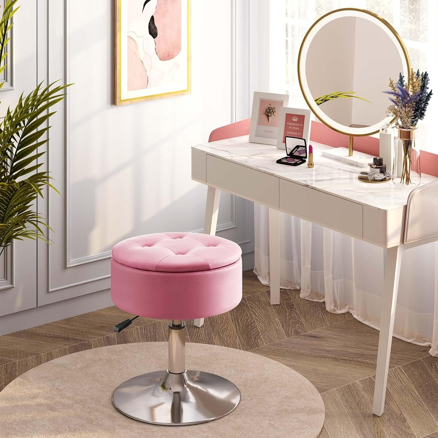 Customers find the vanity stool to be of high quality, comfortable, and easy to assemble, taking just 5 minutes or less to put together. They appreciate its appearance, noting it looks more expensive than it is, and its sturdiness, with one customer mentioning it holds up to 180 pounds. The stool features a handy hidden compartment under the seat that doesn’t take up much space, and customers like its adjustable height feature, with one noting it works well for growing children. They consider it worth the price.