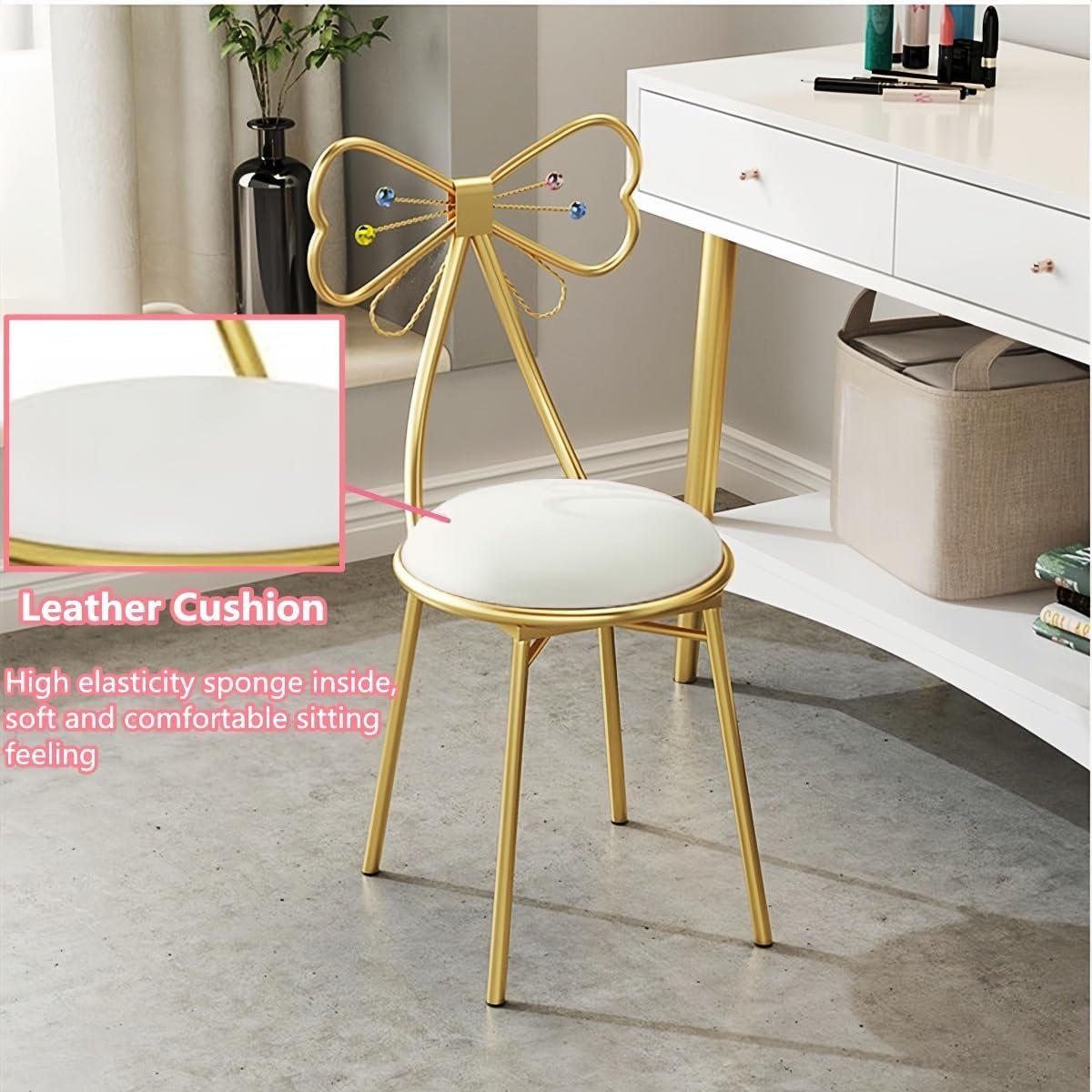 This cute vanity chair features a leather cushion and metal stand for a soft, comfortable, stable and durable seat.
