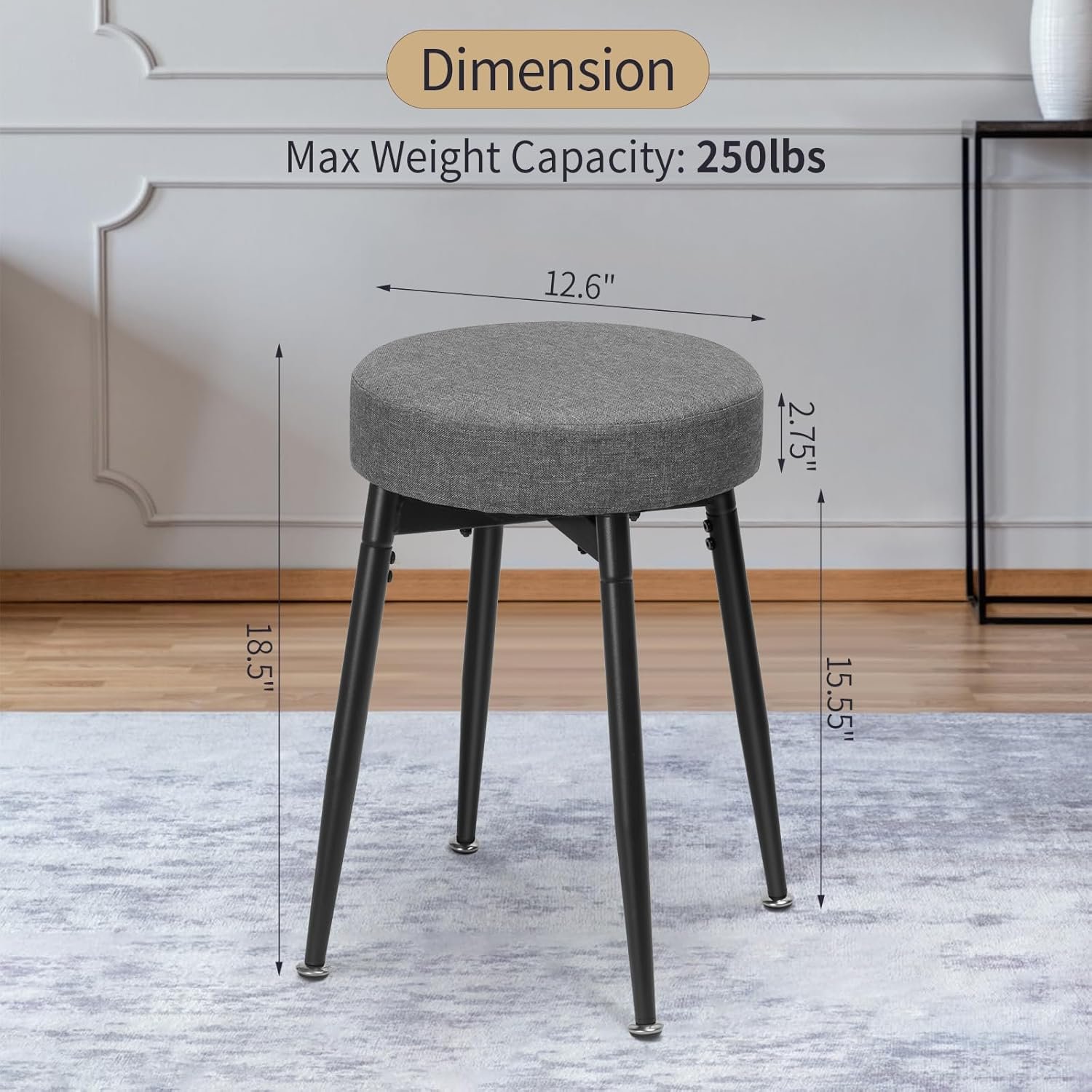 360° Swivel Vanity Stool: This makeup stools for vanity is designed to be both convenient and stylish. With the smooth glide swivel feature, you can effortlessly rotate in any direction up to 360°, which is convenient to use. Compact and easy to store. Perfect for small spaces. When not in use, it can be easily stored under a desk or dresser to save space. Product Dimension: 16″D x 16″W x 18.5″H. Product Height: 18.5″. Round cushion diameter: 12.6″.