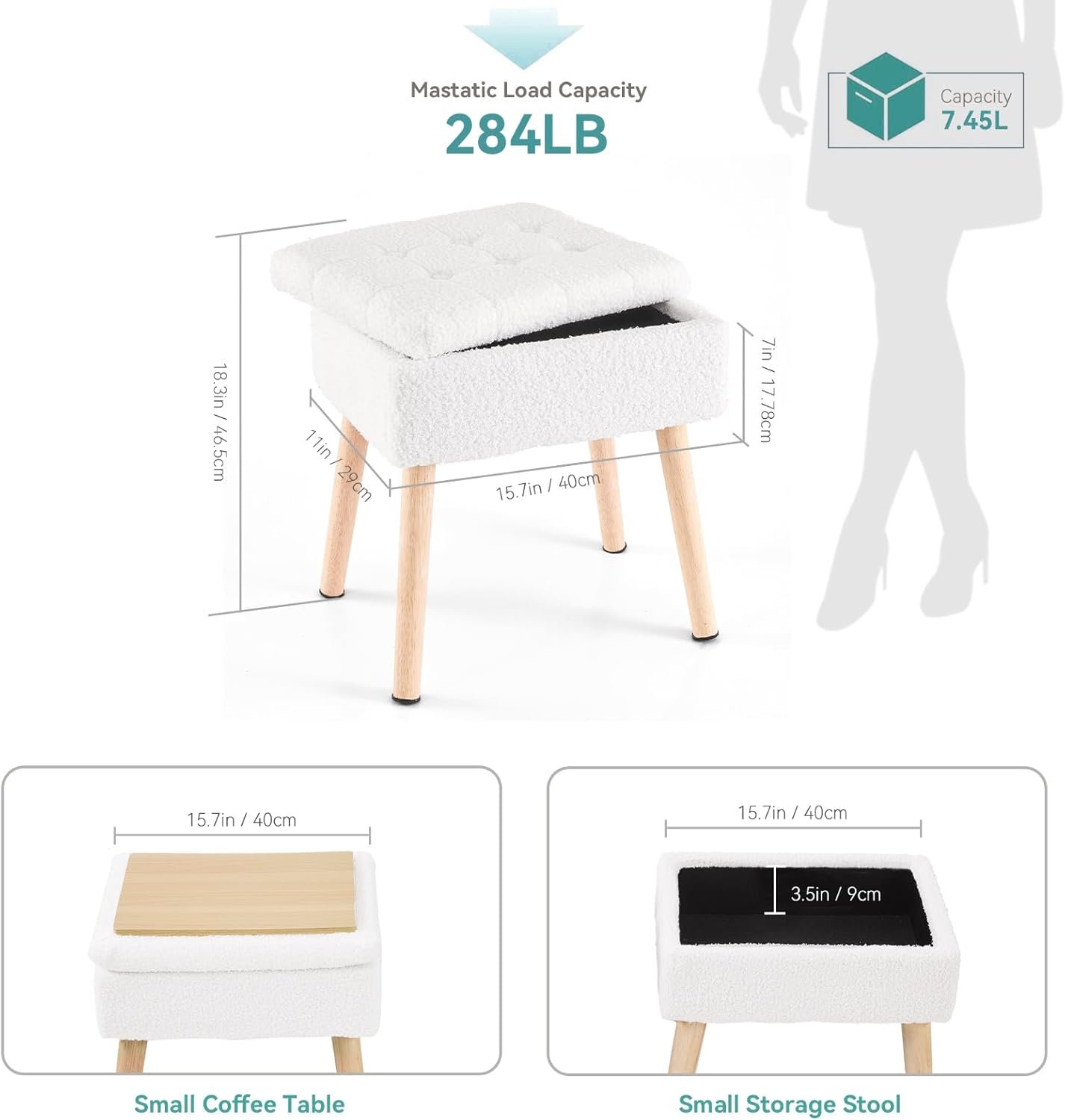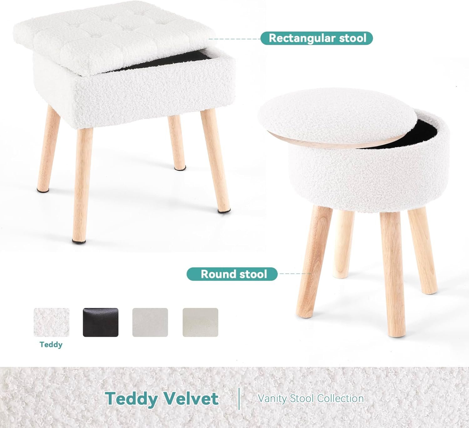 【Small Vanity Stool with Storage】This 12.5″L x 12.5″W x 17.5″H vanity stool features thicked cushioned seat and 7.45L storage, supporting up to 284 lbs. Compact yet mighty. Multiple color options can suitable for girl’s room.