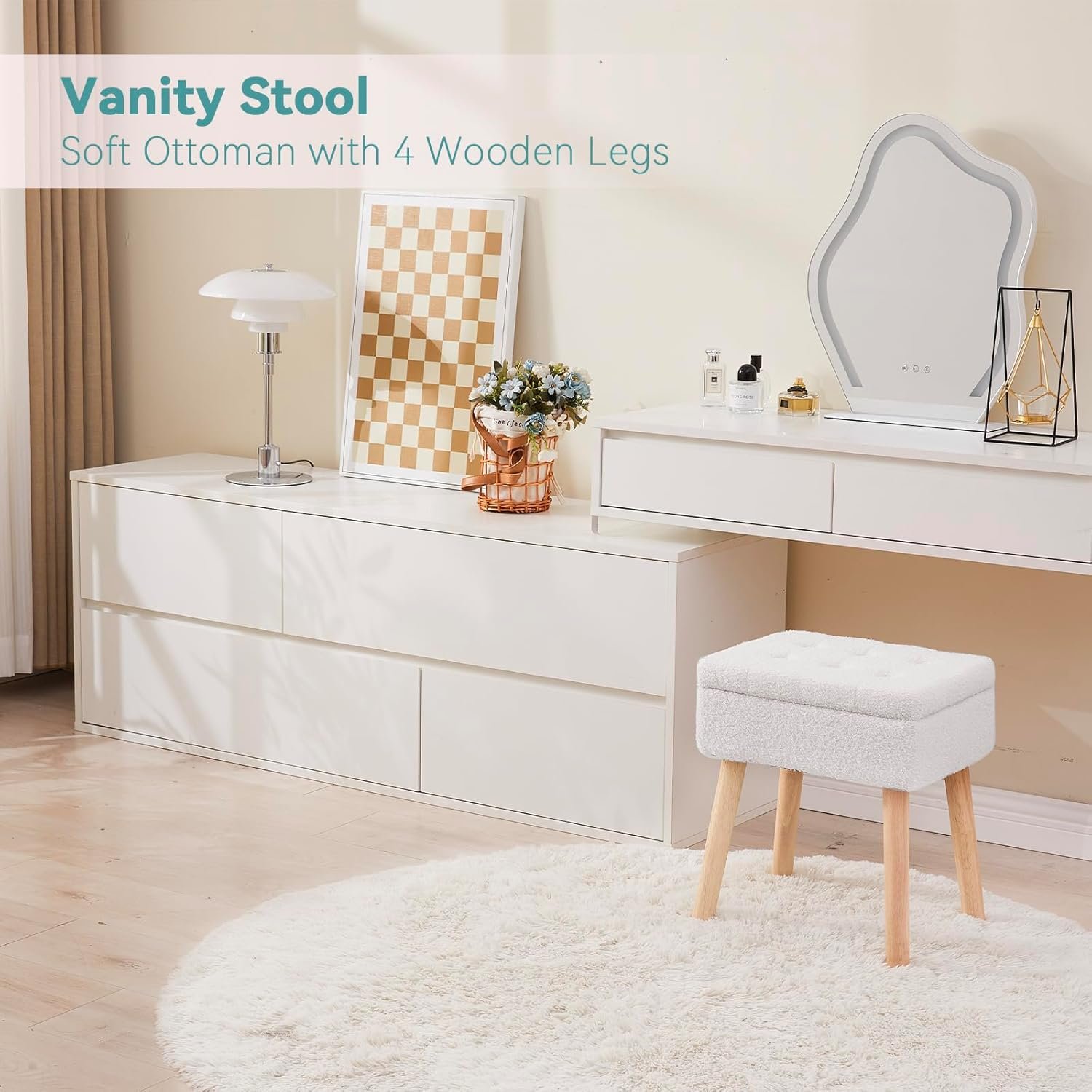 【Versatile Vanity Chair】A plush multi-functional stool perfect for bedrooms, living rooms, or dressing areas. Use it as extra seating, a footrest, or movable storage. Flip the lid to reveal a sturdy wooden tray table—ideal for cosmetics, snacks, or display.