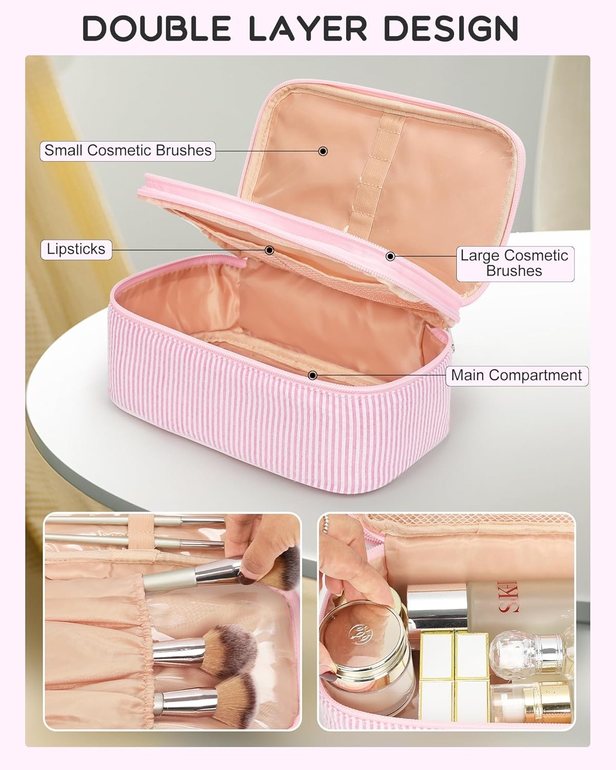 Dual-Layer Versatility – Top Layer with 6 separate elastic bands for lipsticks & eyeliner eyebrow pencil, as well as 4 makeup brushes holder; the bottom layer with 2 mesh pockets for eyeshadow & blush, even 1 big storage space for skincare products or other cosmetics