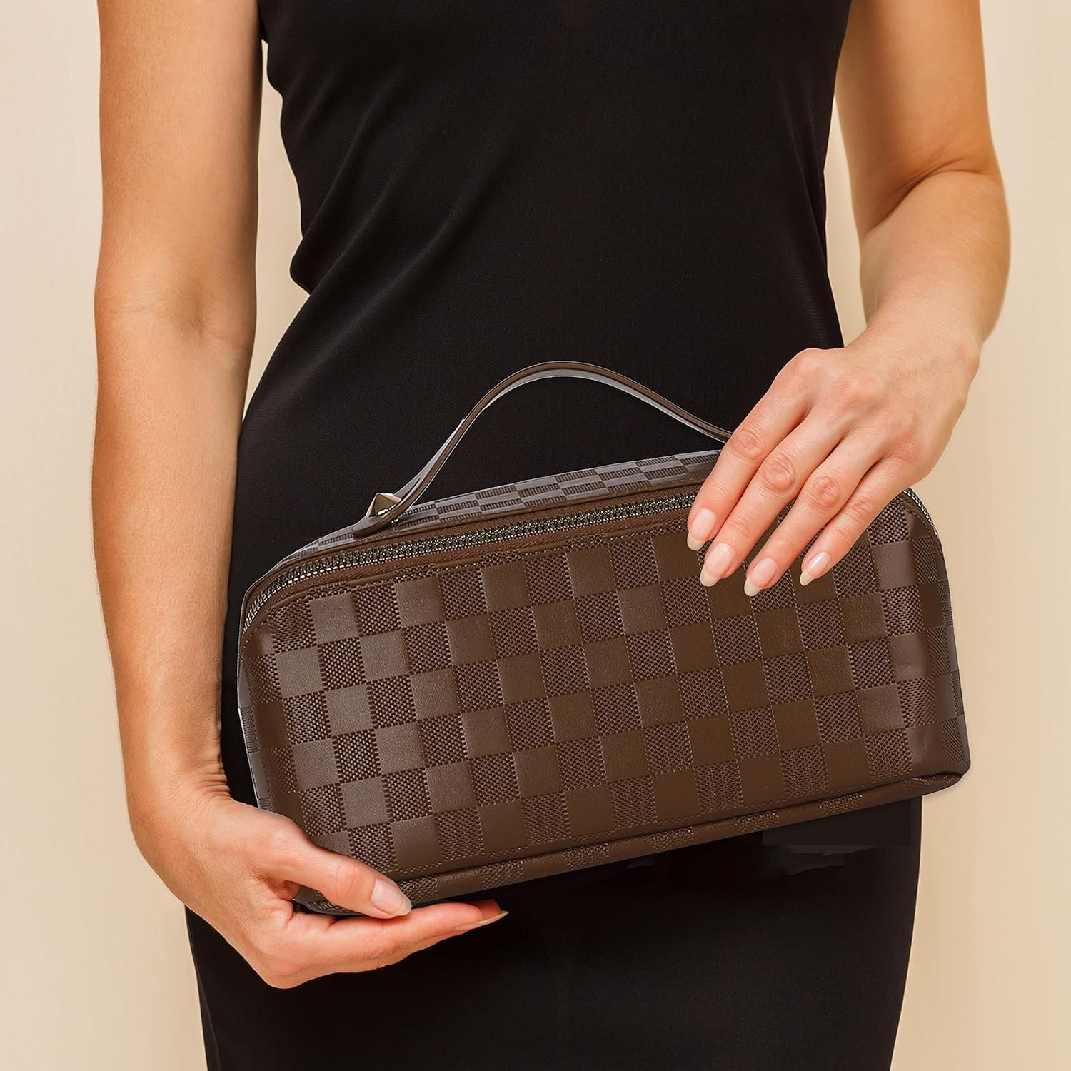 A spacious yet sturdy makeup bag with multiple compartments, perfect for on-the-go storage.
